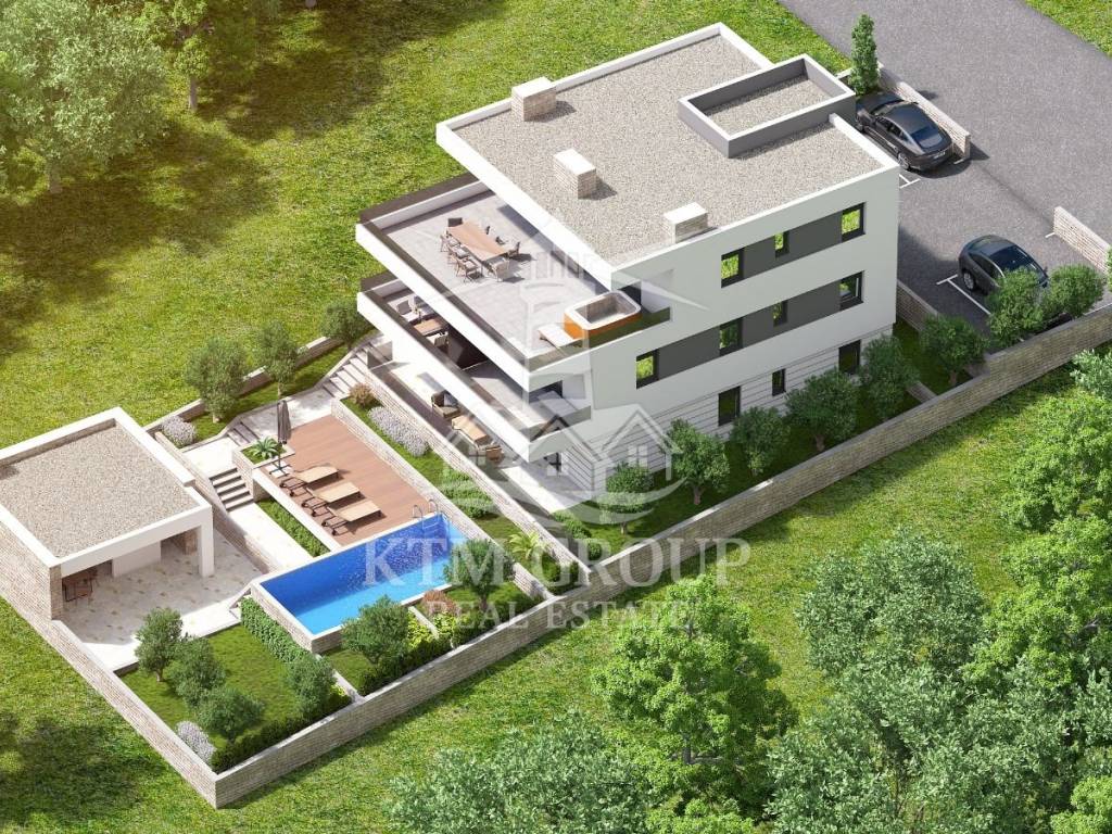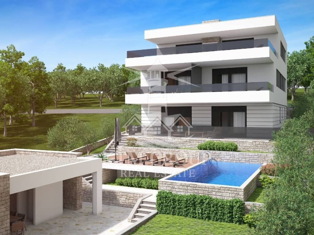 Posedarje – Baugrundstück mit gültiger Baugenehmigung für 4 Wohnungen, einen Pool und eine Sommerküche mit herrlichem Meerblick