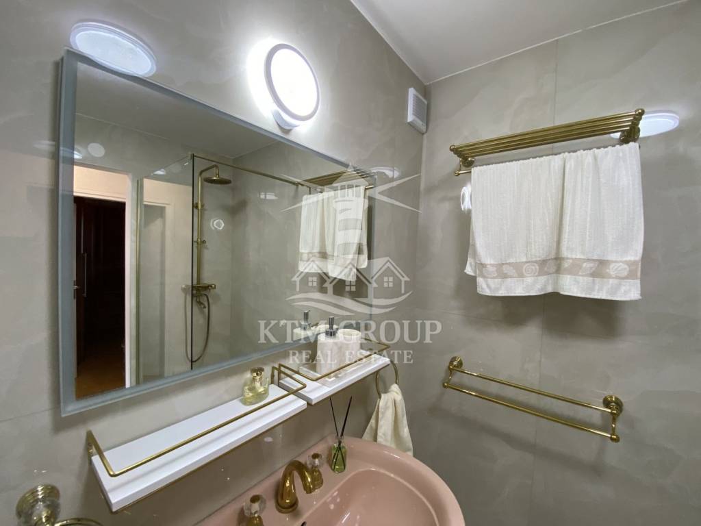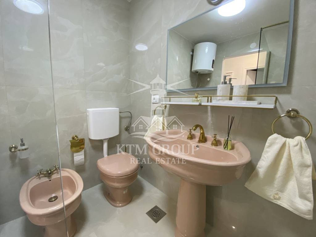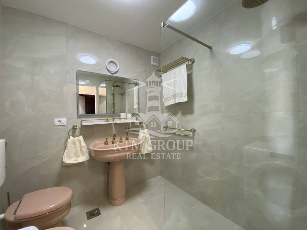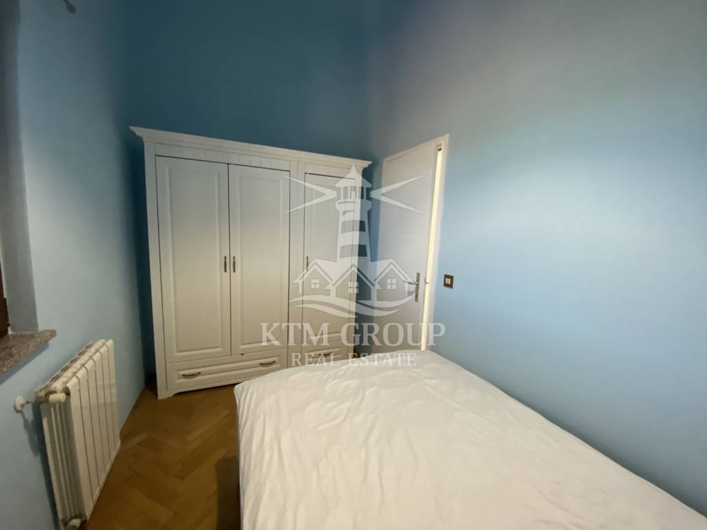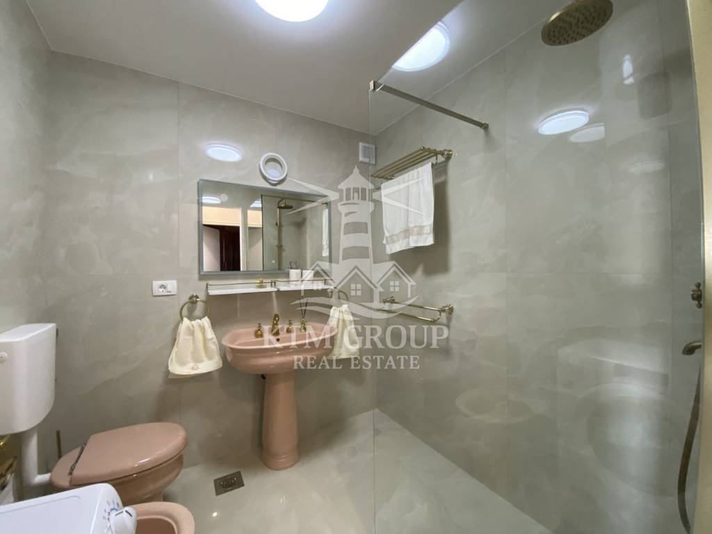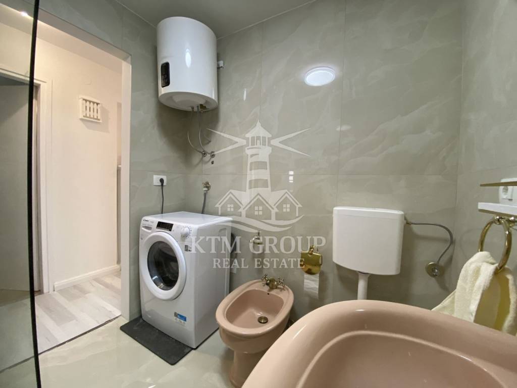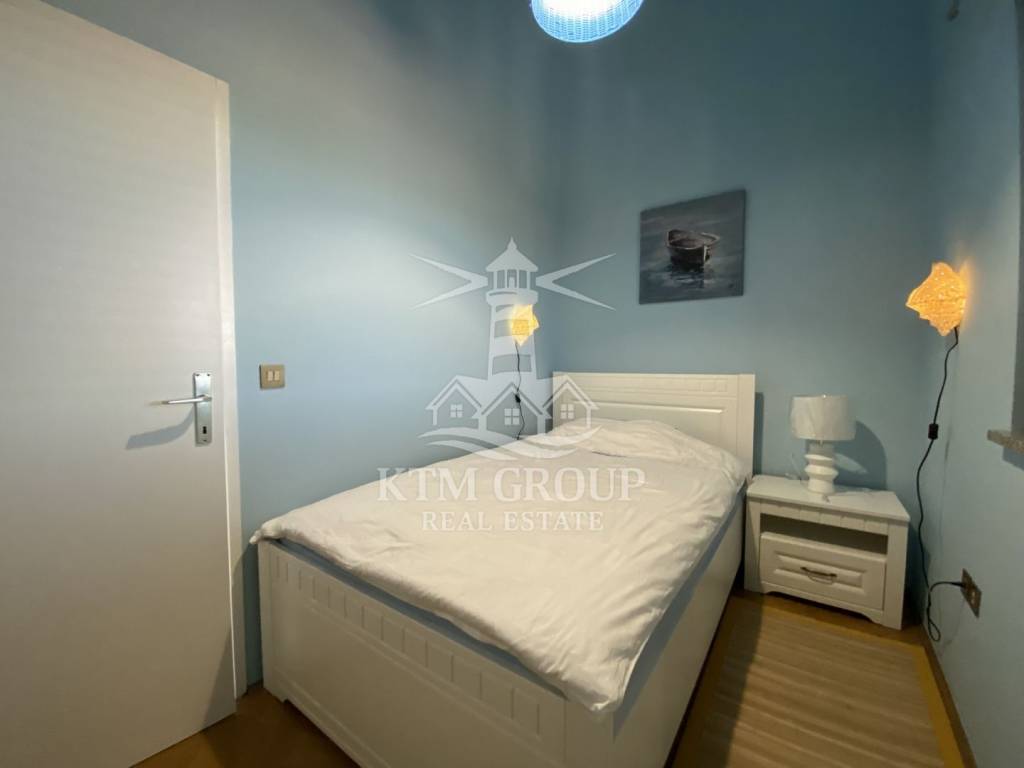 Die Wohnung hat eine Gesamtfläche von 71 m² und einen äußerst praktischen Grundriss. Vom Eingangsbereich gelangt man in den großzügigen, offenen Wohn- und Küchenbereich. Die Küche ist durch eine Theke elegant vom restlichen Wohnbereich abgetrennt. Vom Wohnzimmer aus hat man Zugang zu einem großen Balkon mit herrlichem Blick auf Umag.