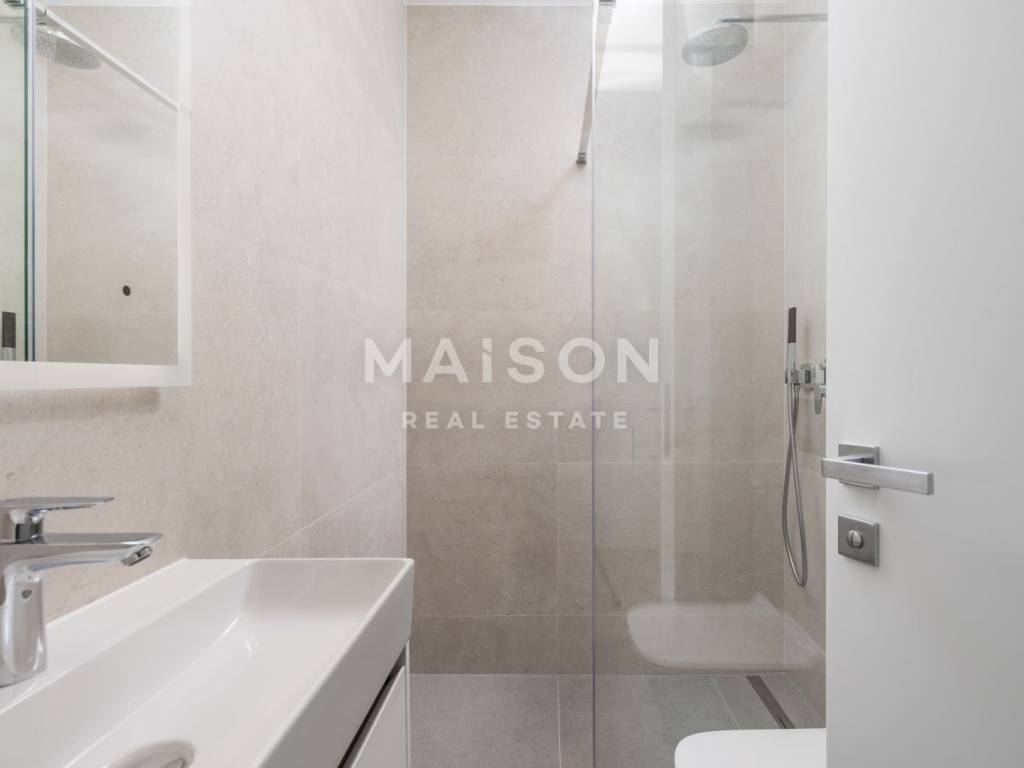 Bei der Innenausstattung wurden hochwertige Materialien verwendet, darunter dreischichtiger Eichenparkett und Aluminiumfenster, was den modernen und eleganten Charakter des Raumes zusätzlich unterstreicht.