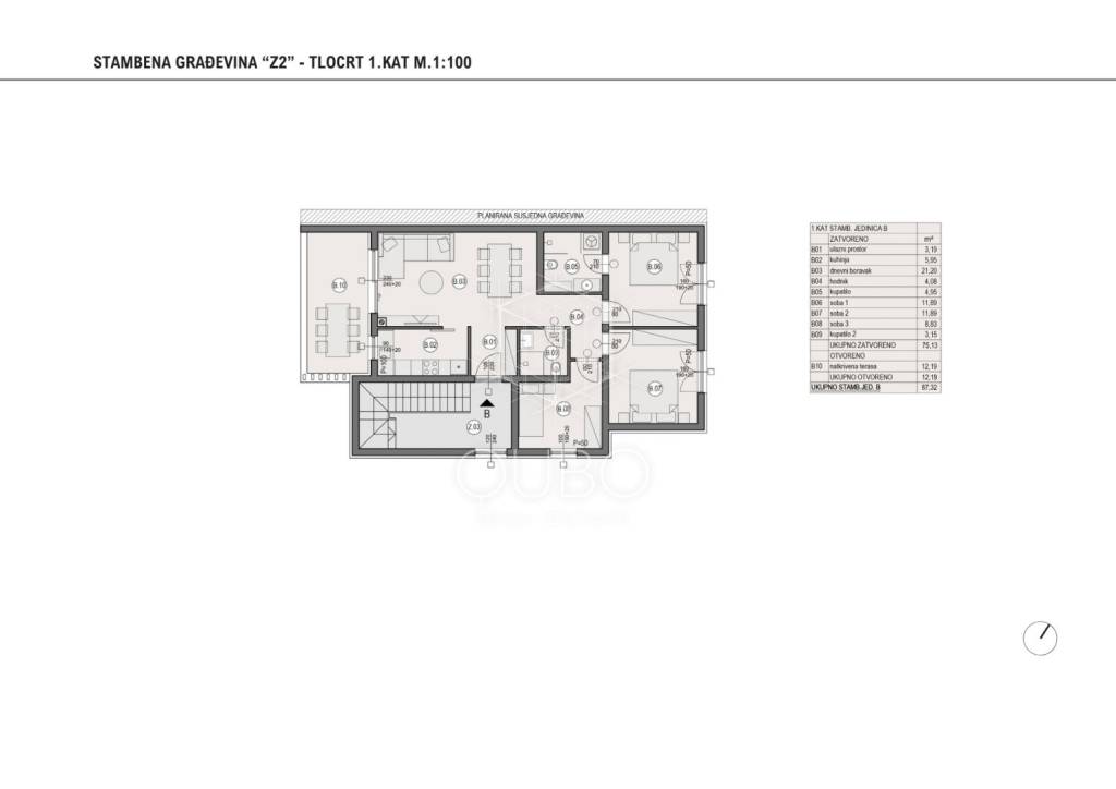 Zum Verkauf steht Wohnung B-Z3, ein stilvoller Penthouse im ersten Stock eines kleinen Wohngebäudes (Z3), derzeit im Bau. Die Fertigstellung ist für Sommer 2026 geplant.