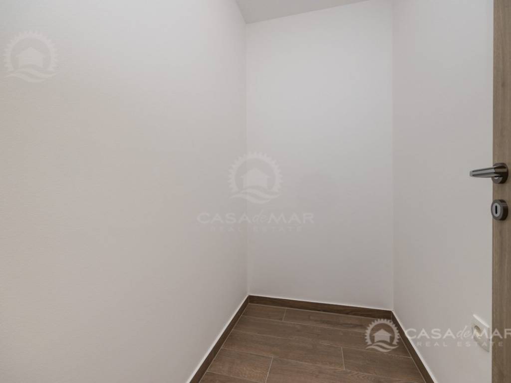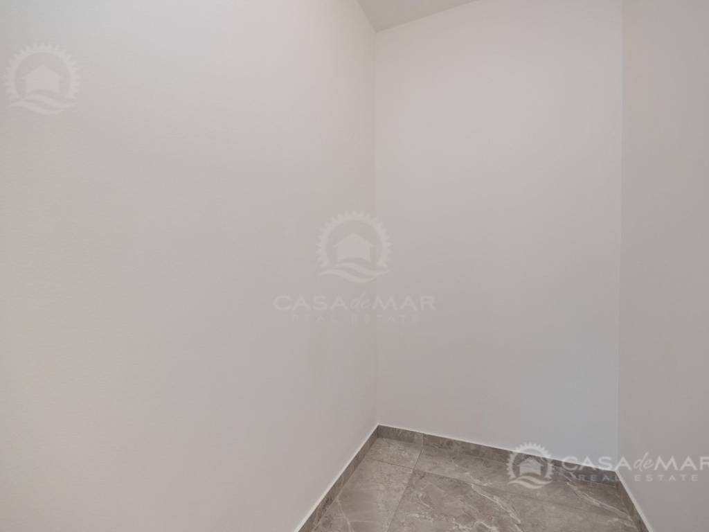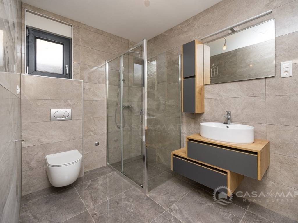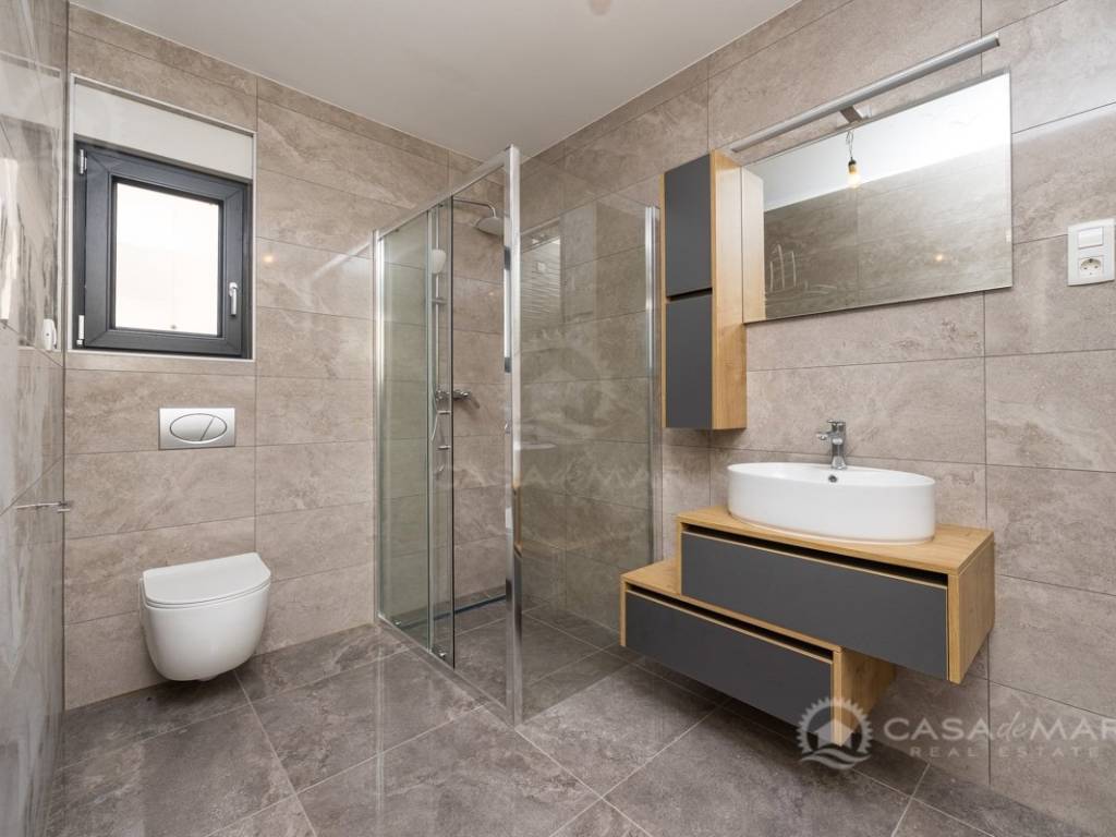 Die Wohnung verfügt über eine Wohnfläche von 90 m², einen eigenen Eingang, einen Gartenbereich von 100 m² sowie einen privaten Parkplatz auf dem gemeinschaftlichen Grundstück. Die untere Etage umfasst eine überdachte Terrasse, ein großzügiges Wohnzimmer mit Essbereich und Küche, eine Garderobe, einen Abstellraum sowie ein modernes Badezimmer. Eine Innentreppe führt in die obere Etage, wo sich ein weiteres Badezimmer, ein Abstellraum und zwei Schlafzimmer befinden. Eines der Schlafzimmer verfügt über eine eigene überdachte Terrasse mit atemberaubendem Panoramablick auf das Meer.
