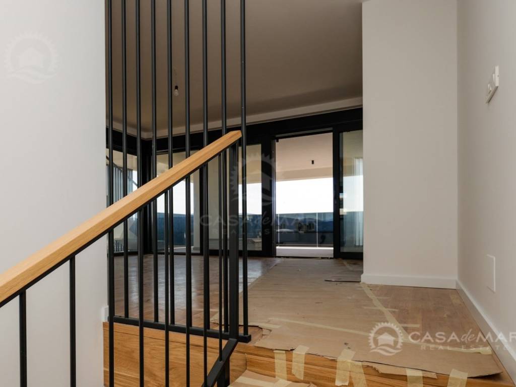 Eine Innentreppe führt in den zweiten Stock, wo sich ein Gäste-WC und der geräumige offene Wohnbereich mit Küche und Essbereich befinden, mit Zugang zu einer großen überdachten Terrasse und herrlichem offenem Meerblick.