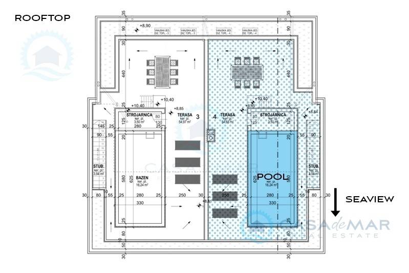 Von der Terrasse führen Treppen zur privaten Dachterrasse, die über einen Pool mit Sonnenbereich verfügt – der ideale Ort, um zu entspannen und die spektakuläre Panorama-Meerblick zu genießen.