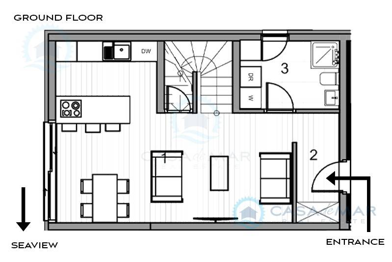 Im Erdgeschoss gibt es ein Wohnzimmer, eine Küche, ein Esszimmer, einen Flur und ein Badezimmer. Das Erdgeschoss und die erste Etage sind durch eine Innentreppe verbunden. Im ersten Stock befinden sich zwei Schlafzimmer mit jeweils eigenem Bad, eines der Schlafzimmer verfügt über einen eigenen Kleiderschrank.