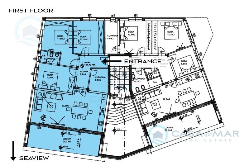 Im ersten Stock eines modernen Neubaus befindet sich eine luxuriöse Dreizimmerwohnung mit einer Fläche von 123 m2, nur 100 m vom Meer entfernt!