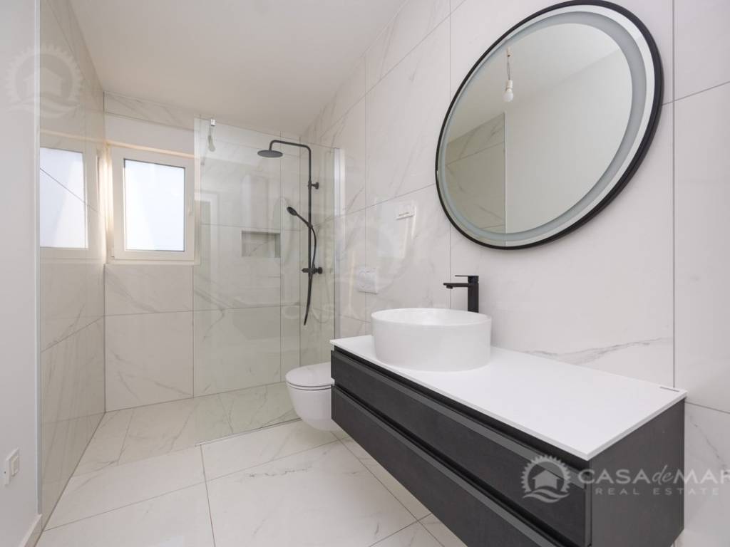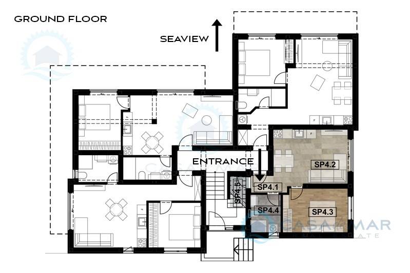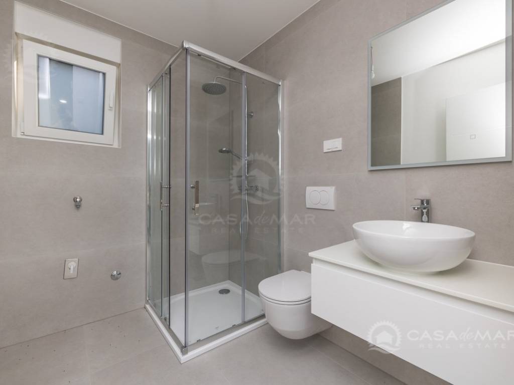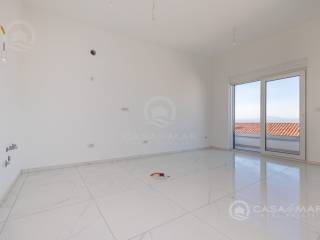 Die Hauptwohnung mit einer Fläche von 78 m² befindet sich im zweiten Obergeschoss des Wohngebäudes. Sie besteht aus einem Eingangsbereich, einem großzügigen Wohnbereich mit Küche und Esszimmer, zwei Schlafzimmern, einem Badezimmer sowie einem zusätzlichen Gäste-WC. Vom Wohn- und Essbereich gelangt man auf eine überdachte Terrasse mit offenem Meerblick, die den Wert und die Attraktivität der Immobilie zusätzlich unterstreicht.