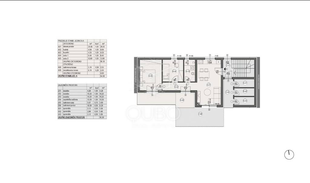 Wohnung A befindet sich im Wohngebäude A2 mit insgesamt drei Wohnungen. Die Nettofläche der Wohnung beträgt 55 m2. Der Grundriss ist als Wohnung mit zwei Schlafzimmern und Wohnraum konzipiert: Der Eingangsbereich führt in einen offenen Wohnraum mit Küche und Essbereich, der auf eine überdachte Terrasse hinausgeht. Zwei Schlafzimmer liegen im ruhigeren Teil der Wohnung, ergänzt durch ein Bad und einen funktionalen Eingangs-/Nutzbereich. Ein zugeordneter Abstellraum und ein Pkw-Stellplatz sorgen für zusätzlichen Komfort im Alltag.