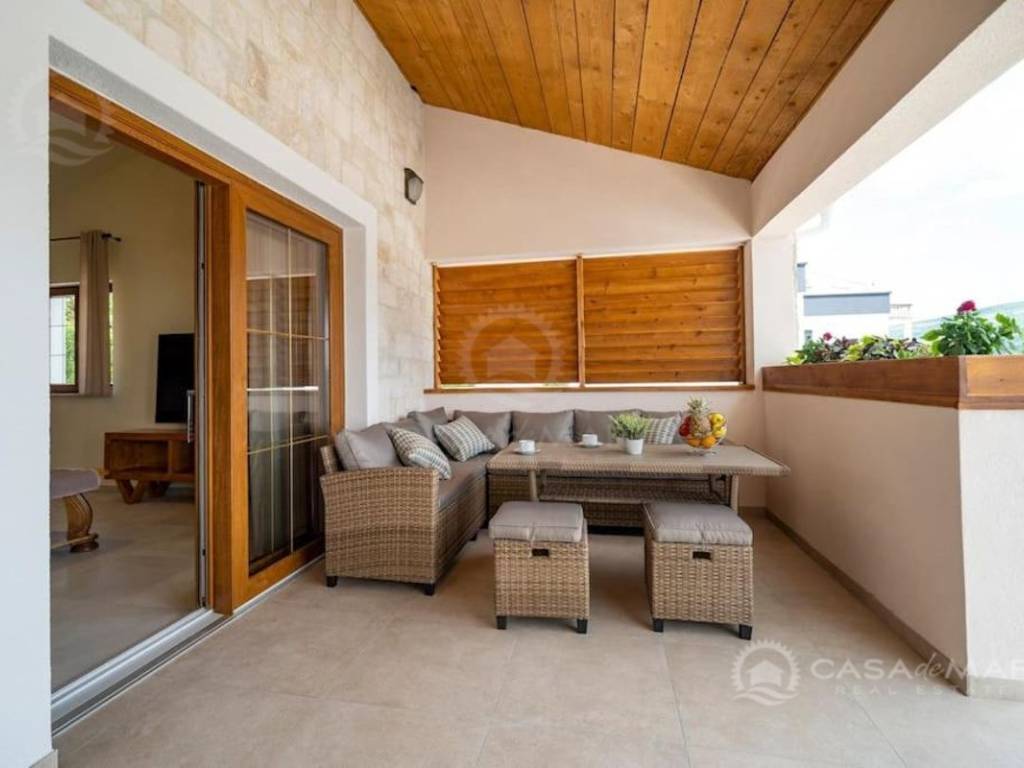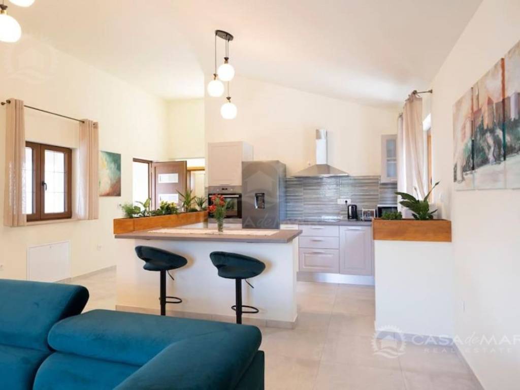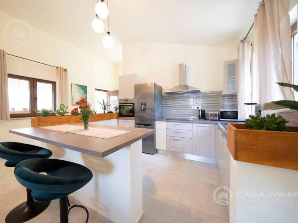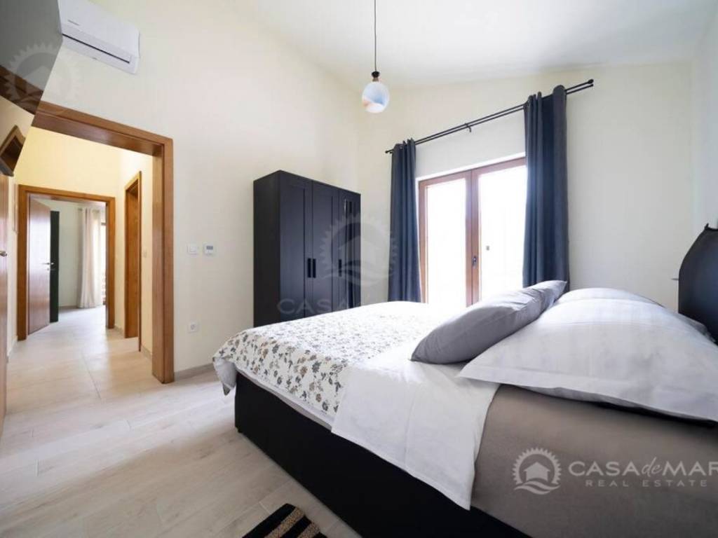 Im Erdgeschoss gibt es ein geräumiges Wohnzimmer mit Zugang zu einer überdachten Terrasse mit wunderschönem Blick auf das Meer, eine moderne Küche und Esszimmer, zwei Schlafzimmer, ein Badezimmer und eine Toilette.