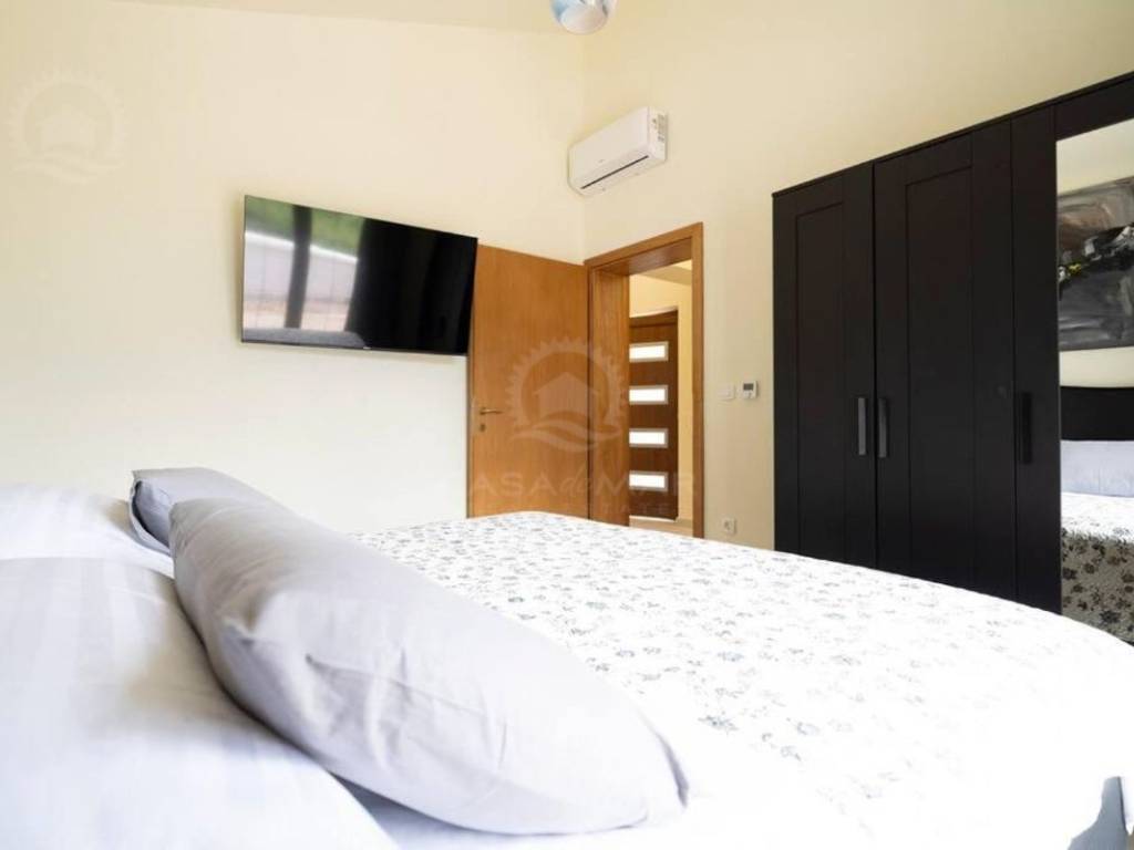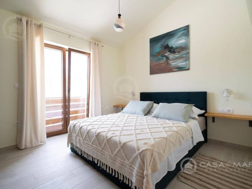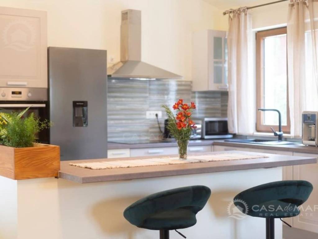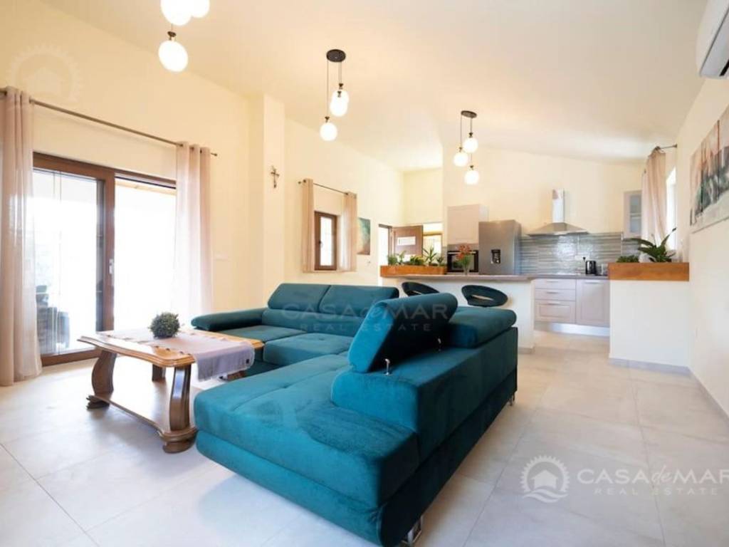 Im Erdgeschoss gibt es ein geräumiges Wohnzimmer mit Zugang zu einer überdachten Terrasse mit wunderschönem Blick auf das Meer, eine moderne Küche und Esszimmer, zwei Schlafzimmer, ein Badezimmer und eine Toilette.