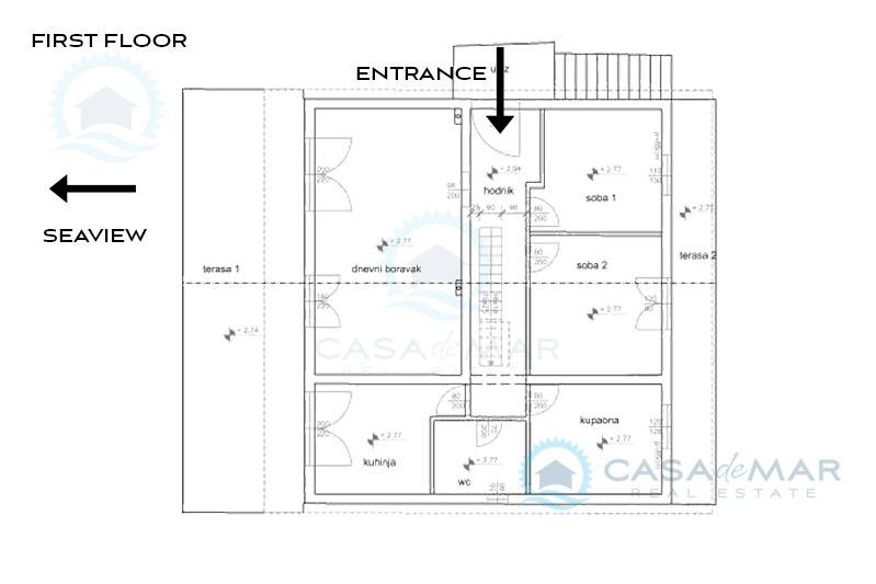 Im ersten Stock gibt es einen Flur, ein Wohnzimmer, eine Küche mit Esszimmer, zwei Schlafzimmer, jedes mit Zugang zu einer gemeinsamen Terrasse, ein Badezimmer und eine Toilette.