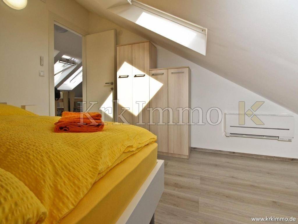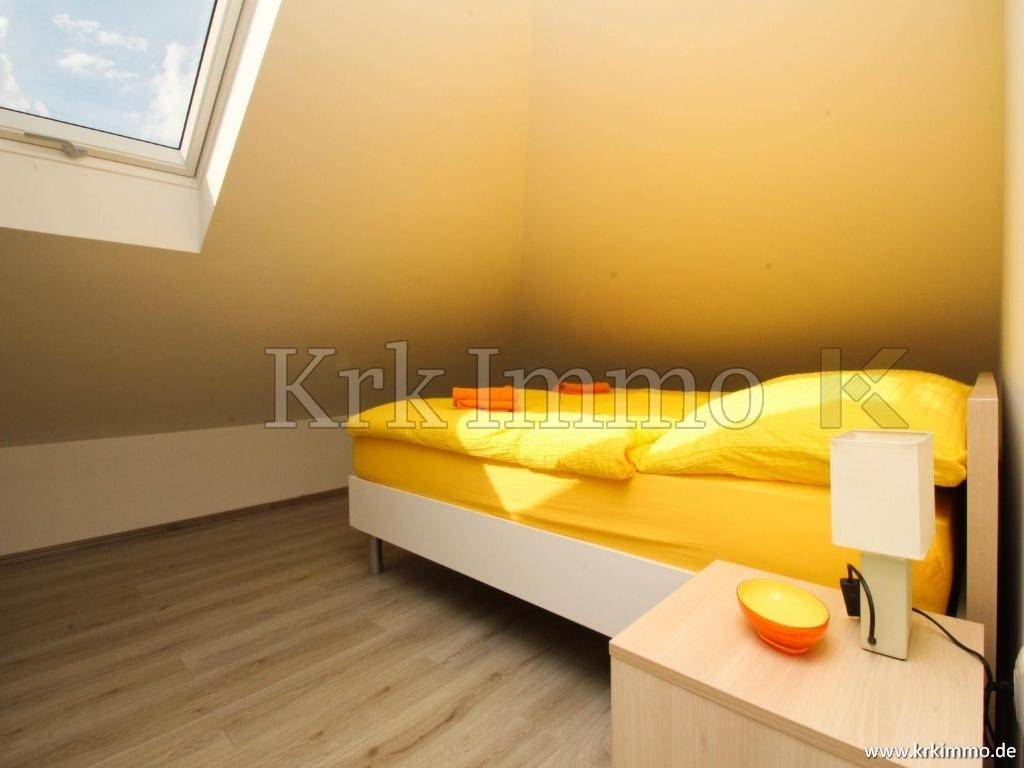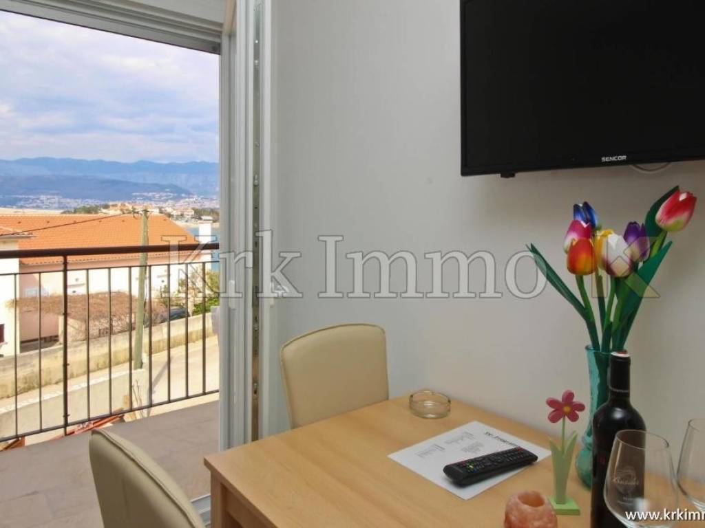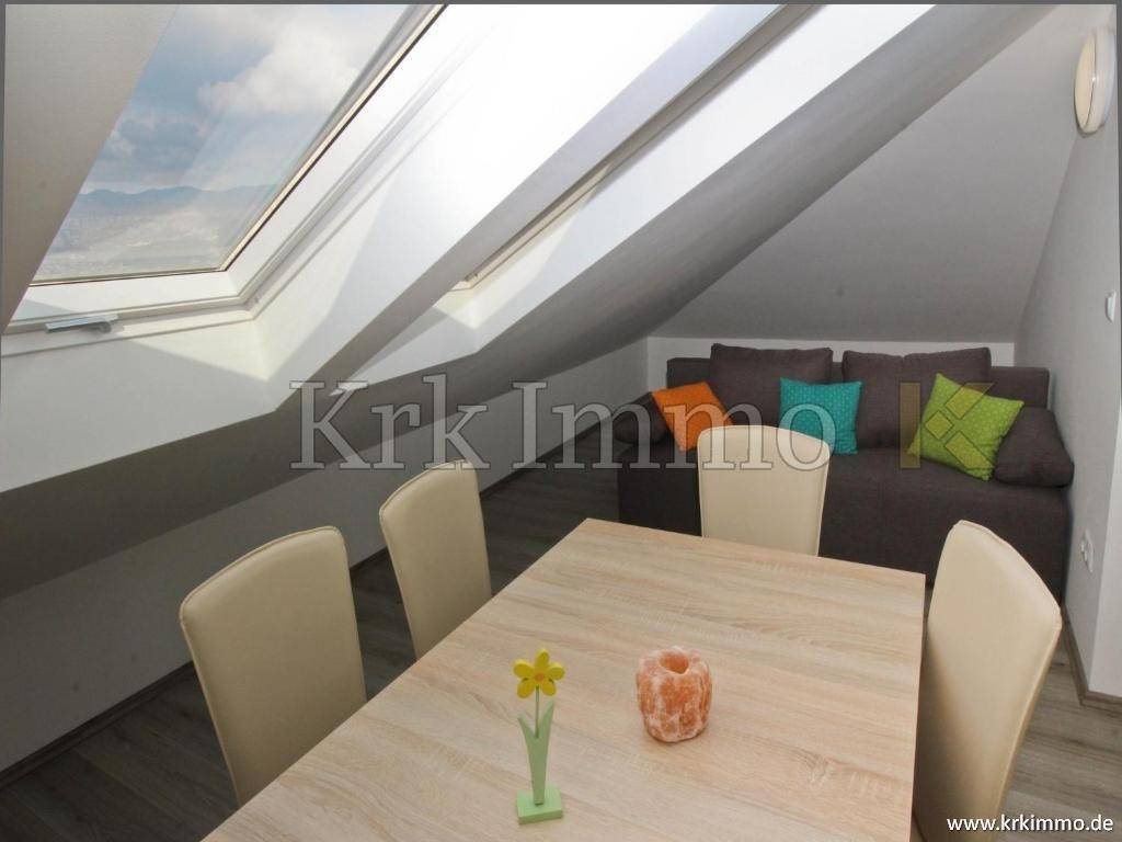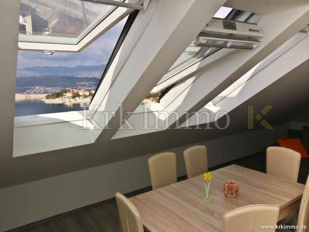 Die Wohnung im Hochdachgeschoss bietet zwei Schlafzimmer, ein Badezimmer, eine Küche, ein Esszimmer, ein Wohnzimmer und einen schönen Blick auf das Meer.