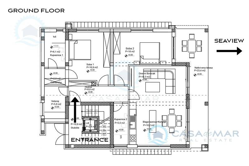 Die Wohnung befindet sich im Erdgeschoss und besteht aus einem Eingangsbereich, einem Wohnzimmer mit Zugang zur überdachten Terrasse von 23 m², einer Küche mit Essbereich, zwei Schlafzimmern, von denen eines über ein eigenes Badezimmer und einen begehbaren Kleiderschrank verfügt, einem Gemeinschaftsbad und einem Hauswirtschaftsraum.