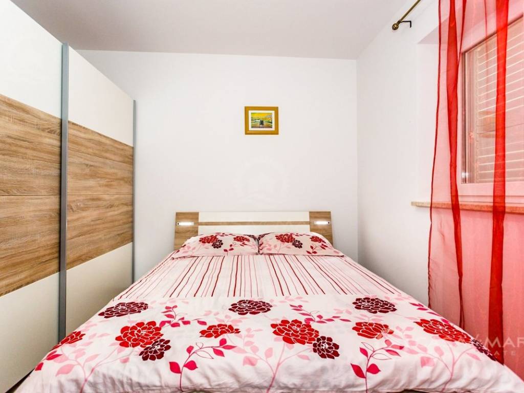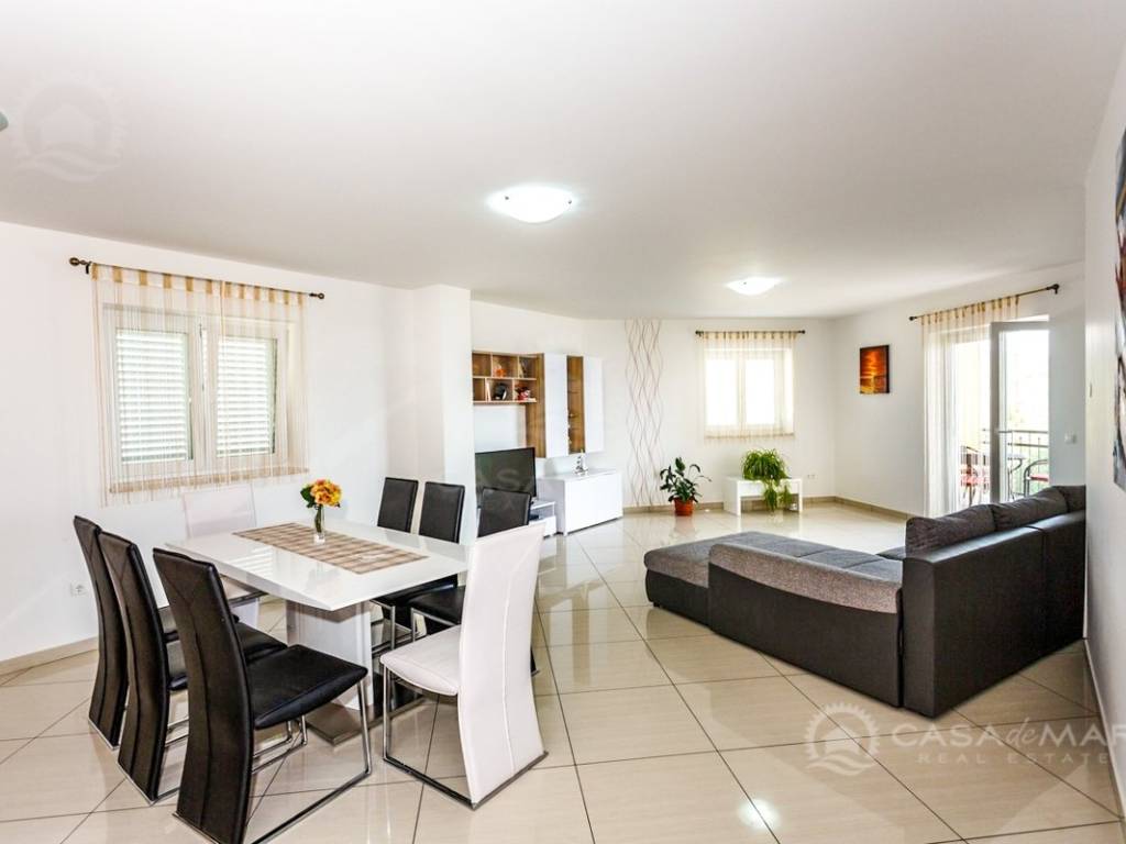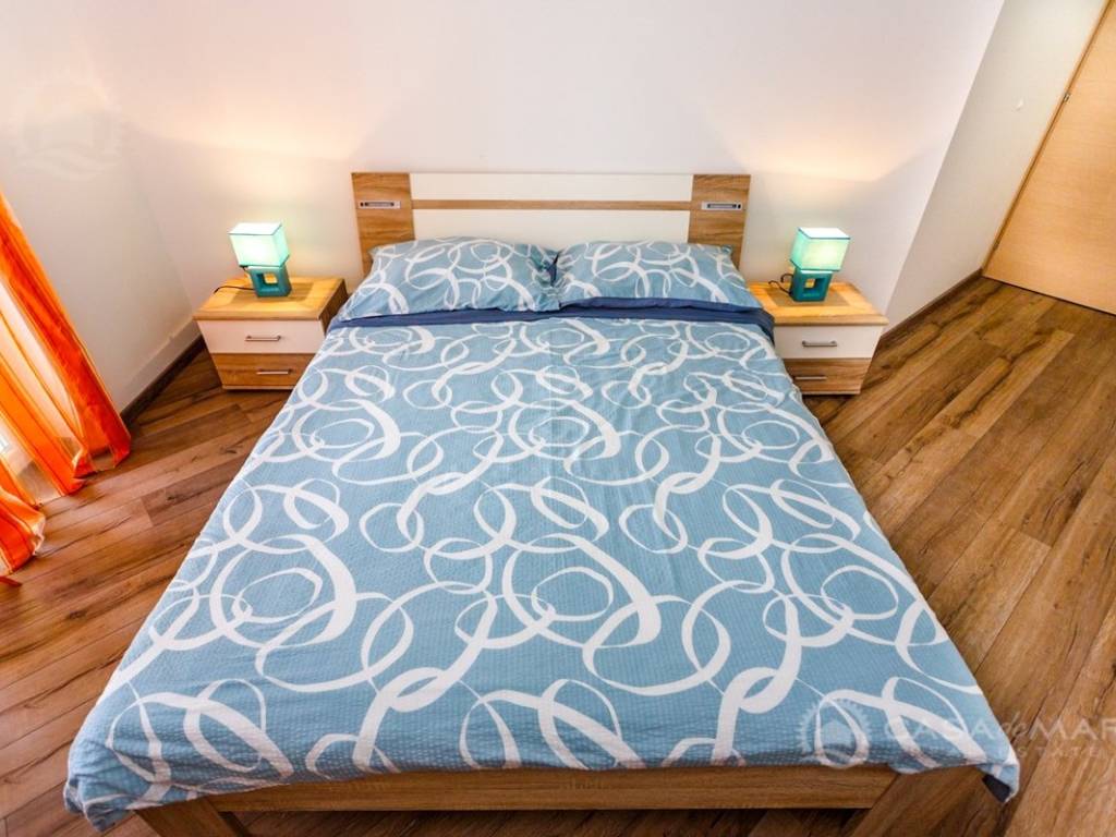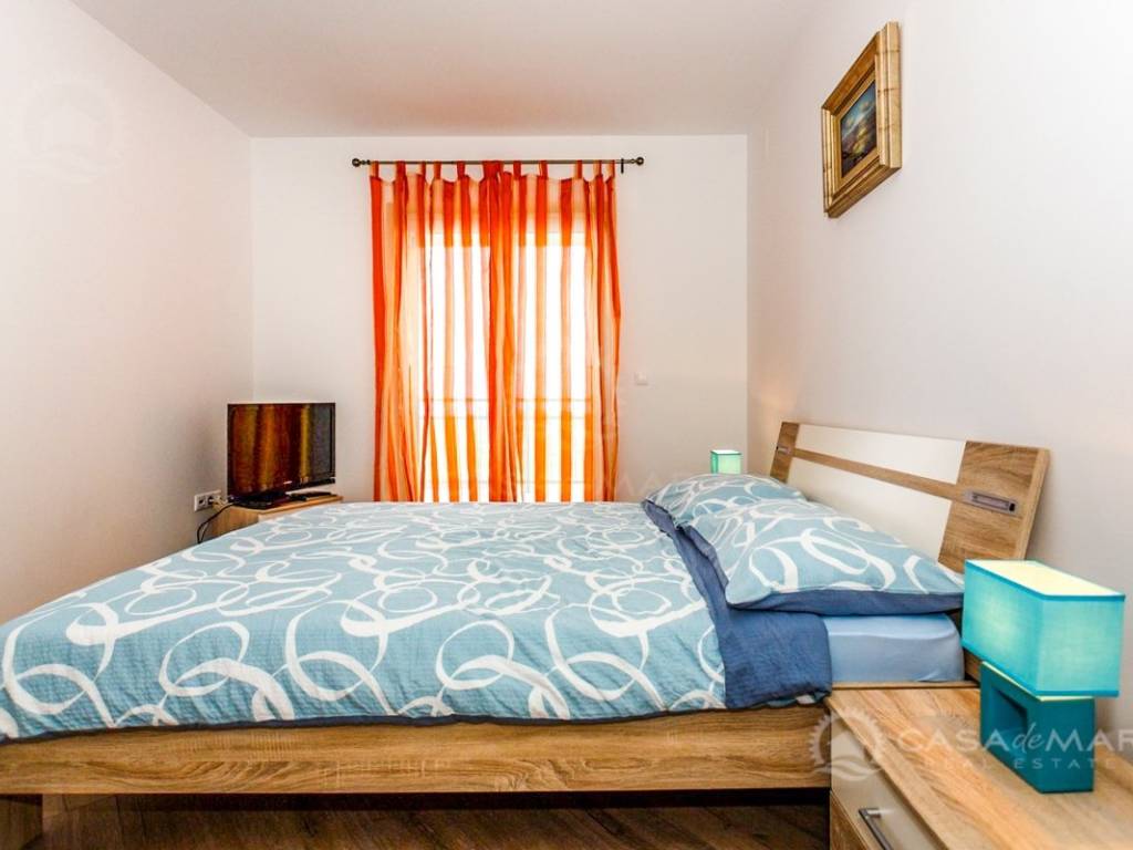 Die Wohnung befindet sich im ersten Stock und besteht aus einer Küche, einem Wohn- und Esszimmer, zwei Schlafzimmern, einem Badezimmer und einem Balkon mit Blick auf das Meer.