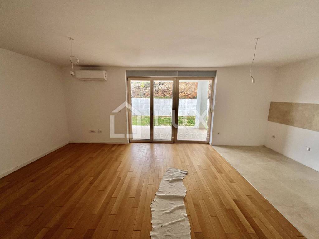 Die zum Verkauf stehende Wohnung befindet sich im Erdgeschoss des Gebäudes und besteht aus Eingangsbereich/Flur, Küche mit Esszimmer und Wohnzimmer, Bad, zwei Schlafzimmern, Terrasse und Garten mit einer Fläche von 134 m2. Die Wohnung hat auch Abstellraum im Keller.