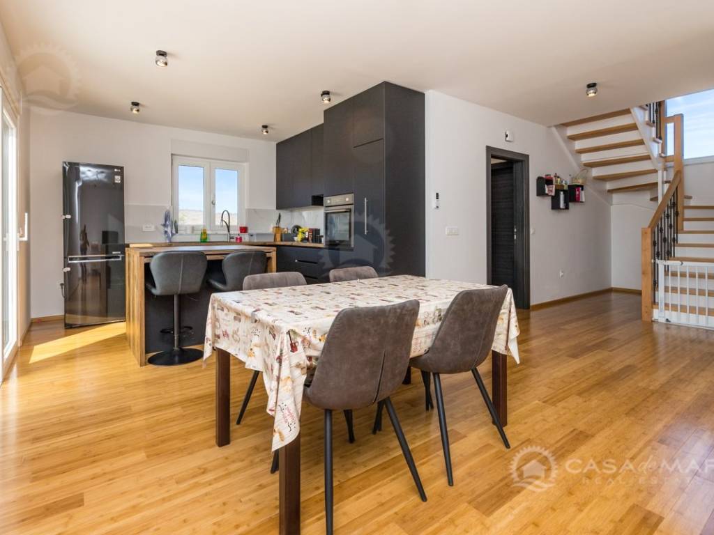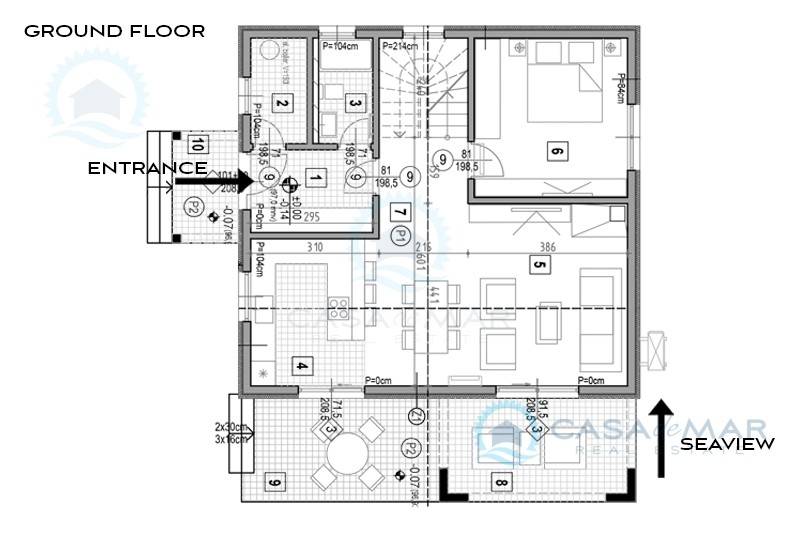 Im Erdgeschoss befindet sich ein großzügiger offener Raum bestehend aus Wohnzimmer, Küche und Esszimmer. Die Küche und das Wohnzimmer haben Zugang zur Terrasse. Im Erdgeschoss gibt es außerdem ein Schlafzimmer, ein Badezimmer und einen Technikraum für Elektrogeräte.