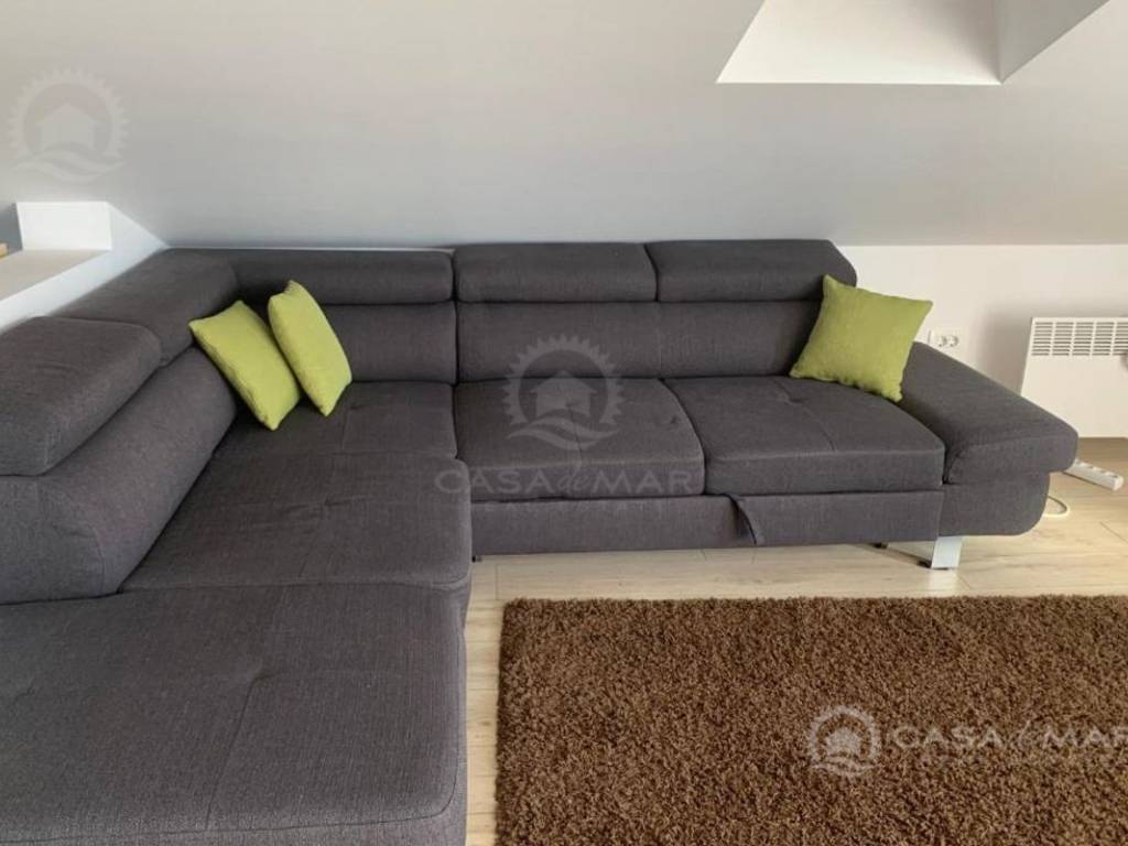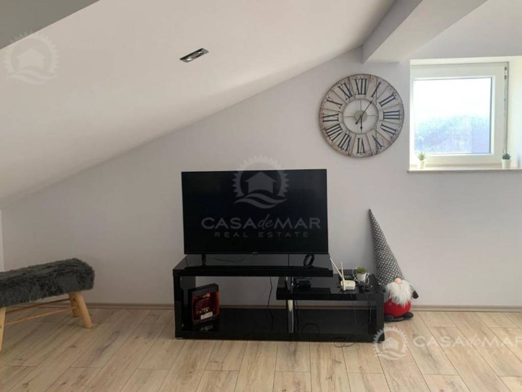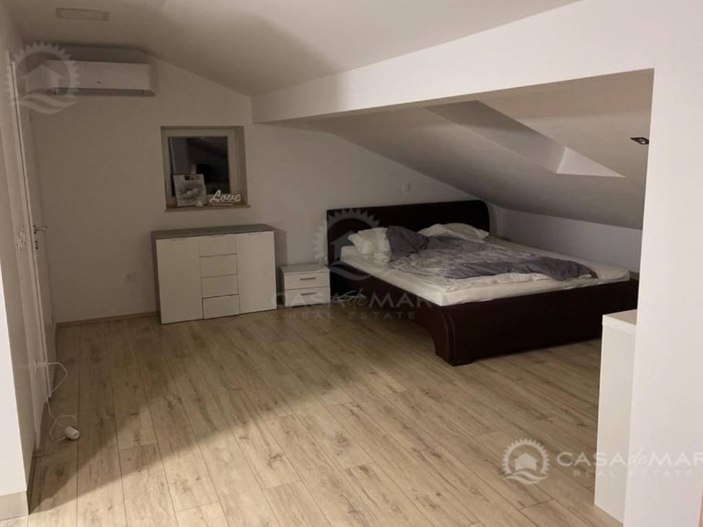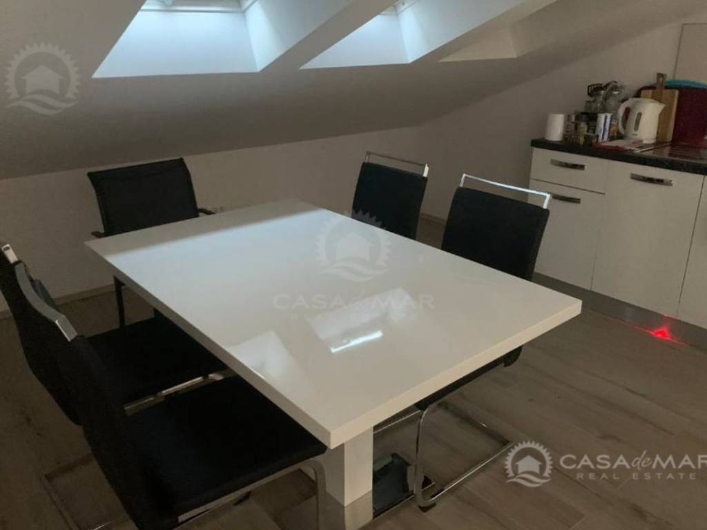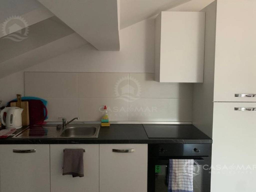 Die 80 m² große Wohnung im hohen Dachgeschoss (2. Etage). Die Wohnung besteht aus einem Schlafzimmer, einem Wohnzimmer, einer Küche, einem Badezimmer, einem Abstellraum und einer Terrasse. Es wurde kürzlich renoviert und bietet teilweise Meerblick.