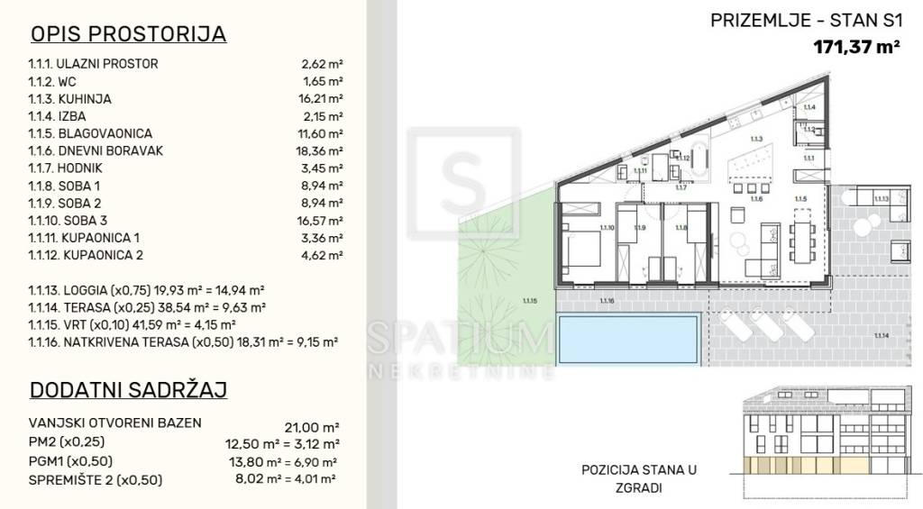 In unserem exklusiven Angebot haben wir das Apartment S1 erhalten. Es besteht aus einer Eingangshalle (2,62 m²), einem Gäste-WC (1,65 m²), einer Küche (16,21 m²), einer Speisekammer (2,15 m²), einem Esszimmer (11,60 m²), einem Wohnzimmer (18,36 m²), einem Flur (3,45 m²), Schlafzimmer 1 (8,94 m²), Schlafzimmer 2 (8,94 m²), Schlafzimmer 3 (16,57 m²), Badezimmer 1 (3,36 m²), Badezimmer 2 (4,62 m²), einer Loggia (19,93 m²), einer Terrasse (38,54 m²), einem Garten (41,59 m²), einer überdachten Terrasse (18,31 m²), einem Außenpool (21,00 m²), einem Außenstellplatz (12,50 m²), einem Garagenstellplatz (13,80 m²) und einem Abstellraum (8,02 m²).