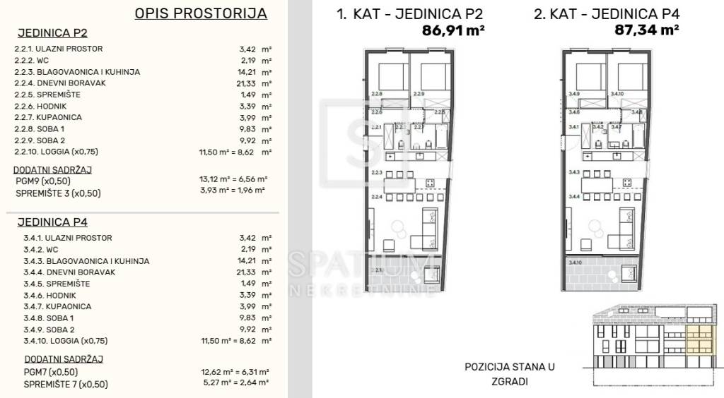 Die Wohnungen gehören den Typen 2S+DB und 3S+DB an und verfügen über Garagenstellplätze und Abstellräume. Die Erdgeschosswohnungen bieten zusätzlich einen privaten Garten. Großzügige, überdachte Terrassen und Loggien mit Meerblick laden ganzjährig zum Verweilen im Freien ein. Zwei Wohnungen (S1 und Penthouse) bieten zudem private Außenpools.