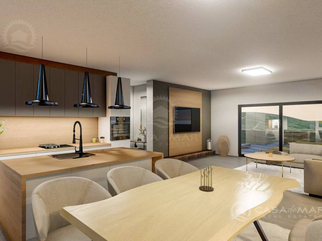 Die Wohnung befindet sich im ersten Stock eines Neubaus und besteht aus einem Eingangsbereich, einem Wohnzimmer mit Zugang zur überdachten Terrasse von 28 m², einer Küche mit Essbereich, zwei Schlafzimmern, von denen eines ein eigenes Badezimmer hat und das andere Zugang zur Terrasse, sowie einem Gemeinschaftsbad.