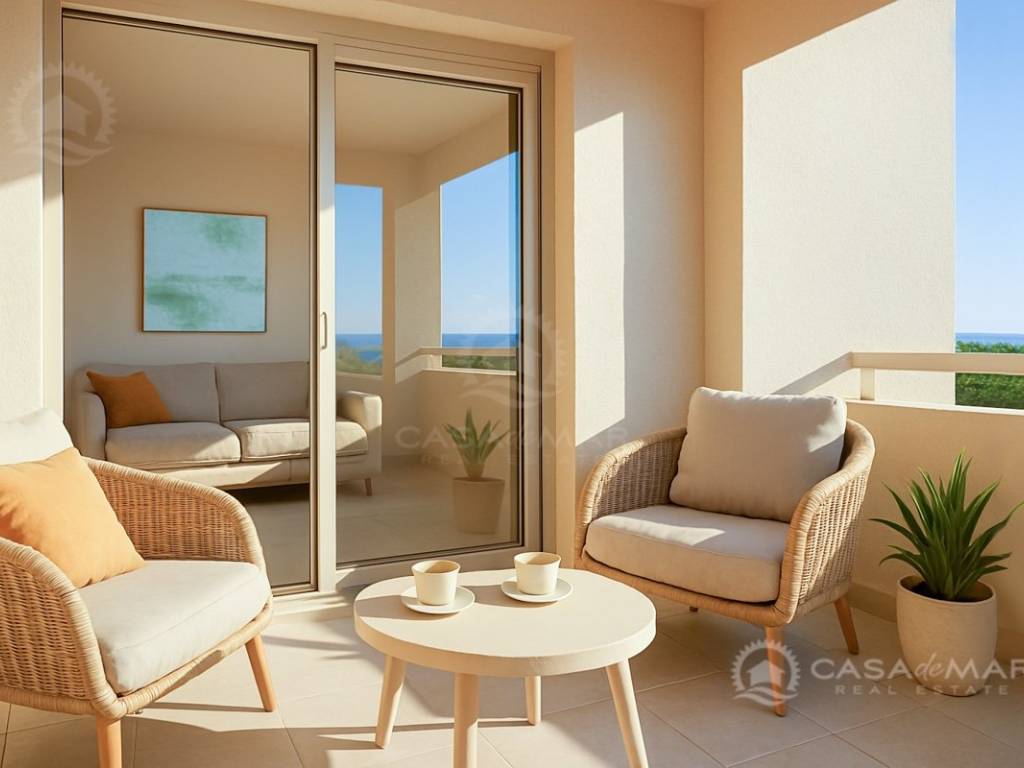 Die Wohnung hat eine Fläche von 60 m² und befindet sich im zweiten Stock eines hochwertigen Neubaus. Sie besteht aus einem offenen Wohnzimmer mit Küche und Essbereich, einem Abstellraum, zwei Schlafzimmern und einem Badezimmer. Vom Wohnzimmer aus gelangt man auf eine geräumige Terrasse, von der aus man einen herrlichen Blick auf das Meer hat.