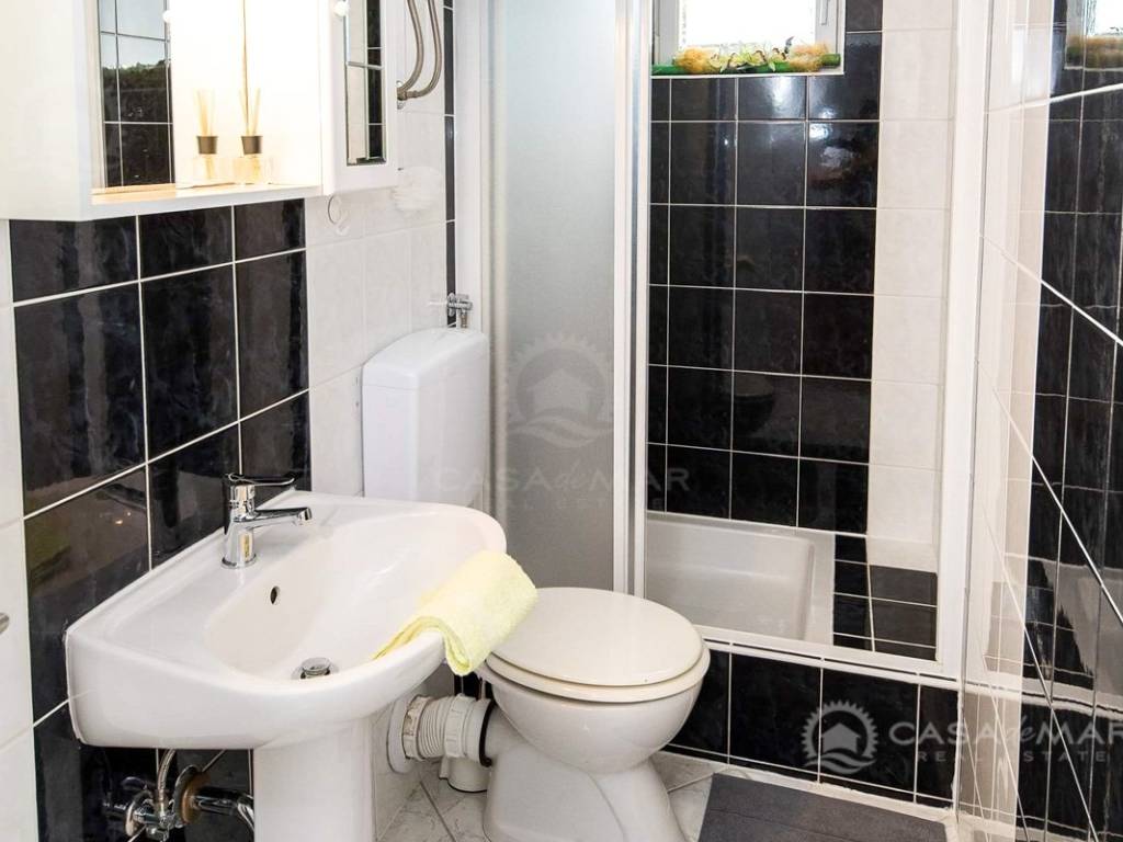 Die Wohnung nimmt das gesamte erste Stockwerk des Hauses ein und bietet großzügigen Wohnraum sowie Privatsphäre. Sie besteht aus einem offenen Wohnbereich mit Küche und Esszimmer, drei Schlafzimmern, zwei Badezimmern, einem Flur und einem Abstellraum. Das Highlight dieser Immobilie ist eine große Terrasse mit überdachtem und nicht überdachtem Bereich, von der aus sich ein herrlicher, offener Meerblick bietet.