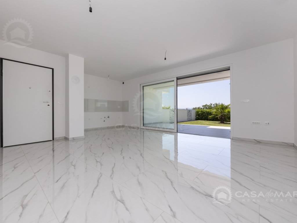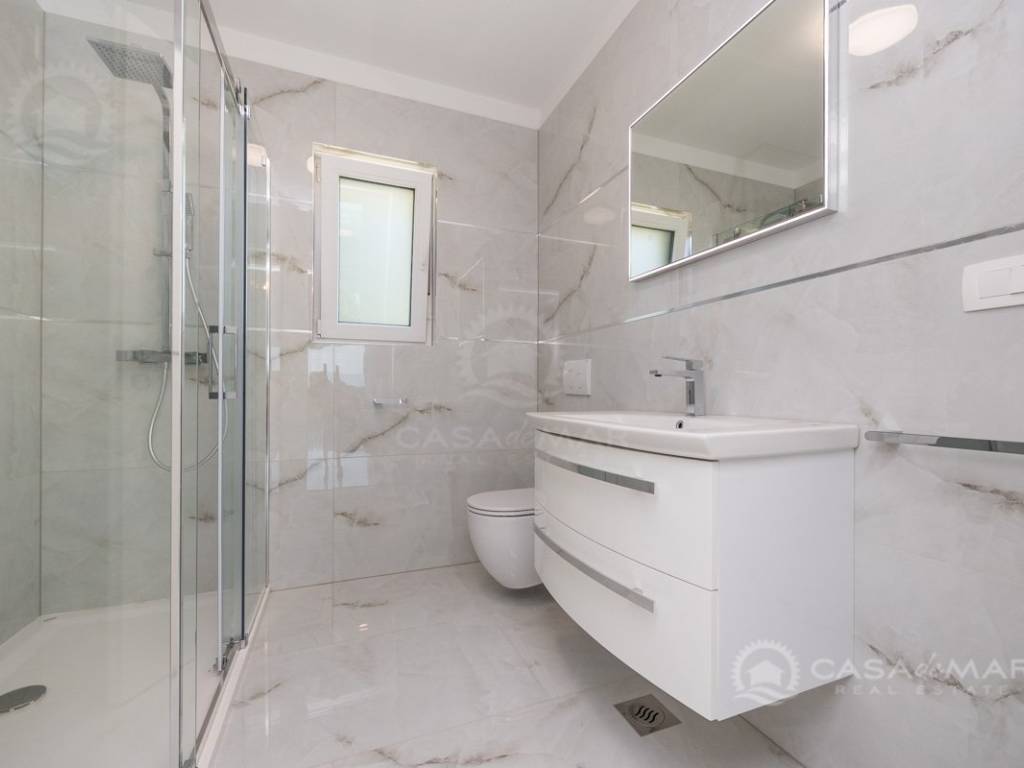 Im ersten Stock befindet sich die zweite Wohnung mit identischem Grundriss und dem zusätzlichen Vorteil einer überdachten Terrasse mit herrlichem, offenem Meerblick. Große Glasflächen sorgen für viel Tageslicht und ein luftiges Raumgefühl.