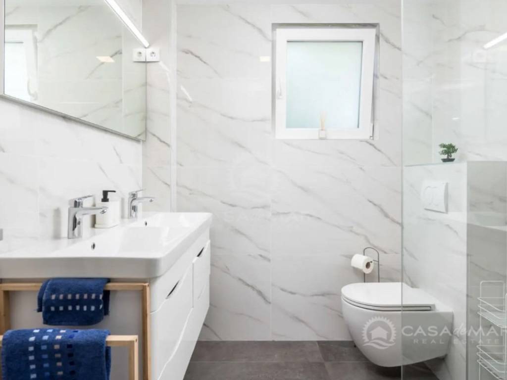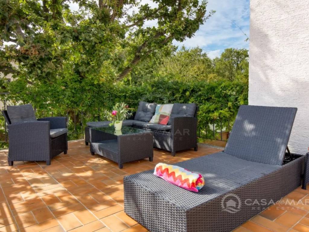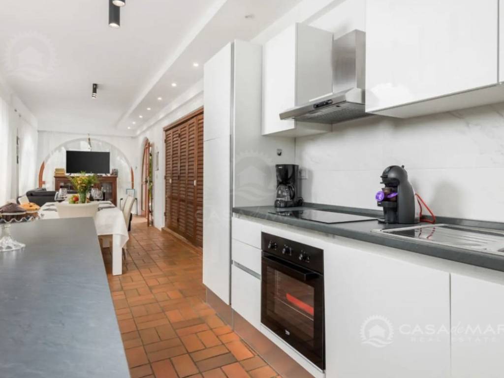Im Erdgeschoss befinden sich zwei Schlafzimmer, ein renoviertes Badezimmer mit Fußbodenheizung, zwei Wohnzimmer, eine Küche mit Zugang zum Balkon sowie ein Esszimmer. Im ersten Obergeschoss gibt es vier Schlafzimmer, jedes mit Zugang zu einem Balkon, sowie ein Badezimmer. Im ausgebauten Dachgeschoss, das einen herrlichen offenen Meerblick bietet, befinden sich zwei weitere Zimmer und ein Badezimmer.