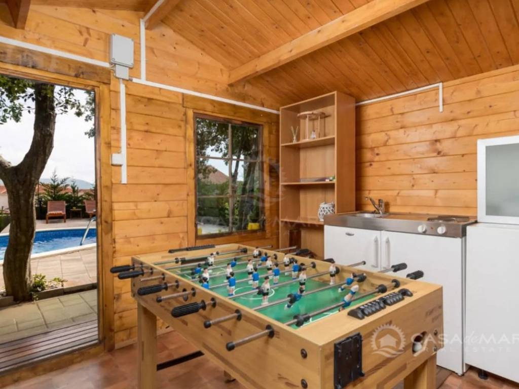 Das Grundstück ist zur Erholung gestaltet – mit Swimmingpool, Sonnenterrasse, Grillplatz und Gartenhaus mit Tischfußball sowie einer Sommerküche. Zur Verfügung stehen auch vier Parkplätze und eine Garage im Keller des Hauses.