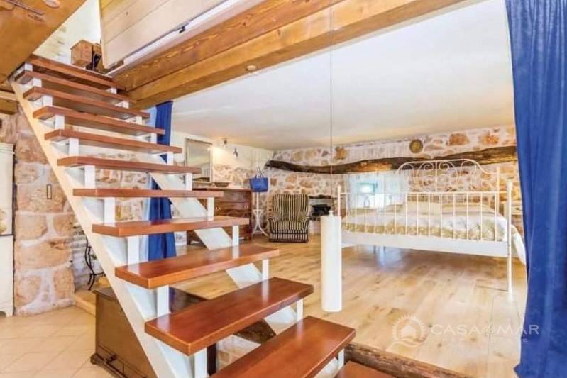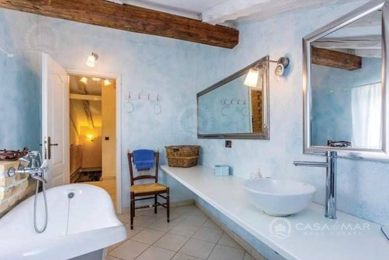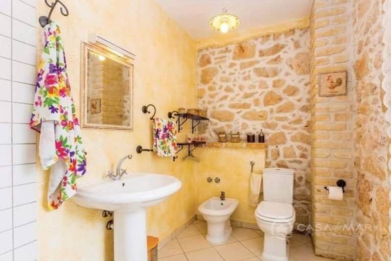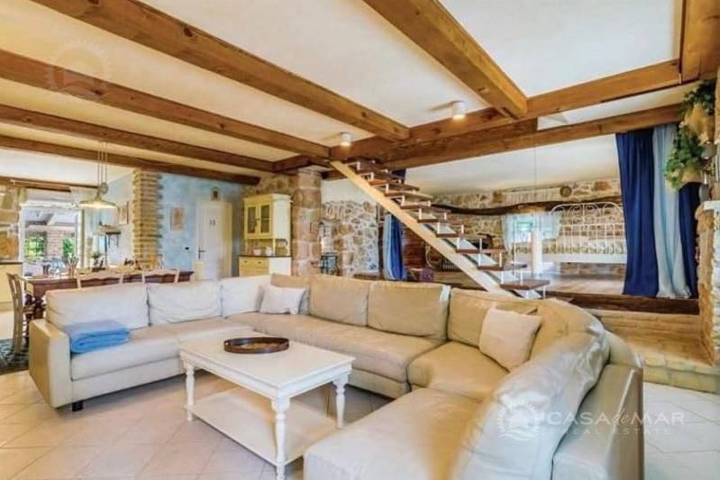 Das Haus erstreckt sich über drei Etagen: Erdgeschoss, Obergeschoss und ein ausgebautes Dachgeschoss. Im Erdgeschoss befinden sich eine Taverne mit einer originalen Steinpresse zur Olivenverarbeitung – ein authentisches Detail mit besonderem Charme – ein Technikraum mit Zentralheizung, ein Badezimmer sowie eine zusätzliche kleine Küche. Über eine Außentreppe gelangt man in das Obergeschoss, wo sich ein geräumiges Wohnzimmer mit Kamin, eine Küche mit Essbereich, ein Badezimmer und eine Galerie befinden, die als Schlafzimmer, Arbeitszimmer oder Entspannungsraum genutzt werden kann. Vom Wohnzimmer aus hat man Zugang zu zwei Terrassen – eine führt zum Pool und Garten, die andere bietet Ruhe und Privatsphäre auf der gegenüberliegenden Hausseite. Im ausgebauten Dachgeschoss befinden sich drei Schlafzimmer sowie ein weiteres Badezimmer, ideal für Familie oder Gäste.