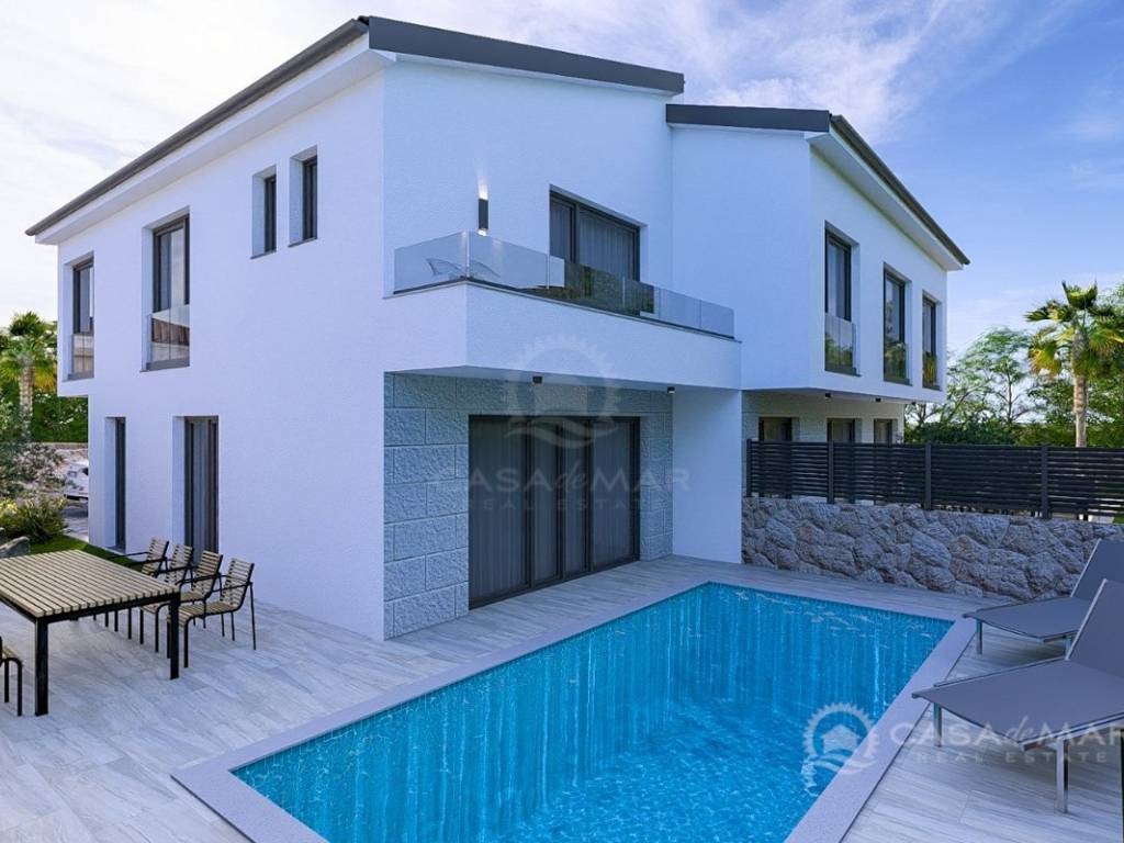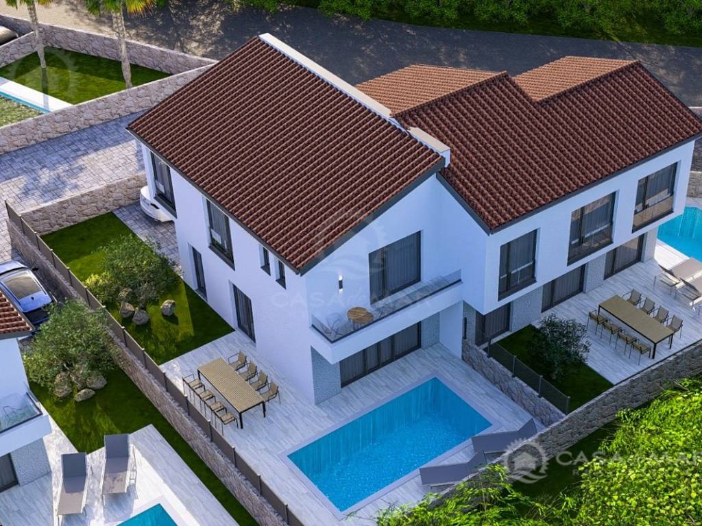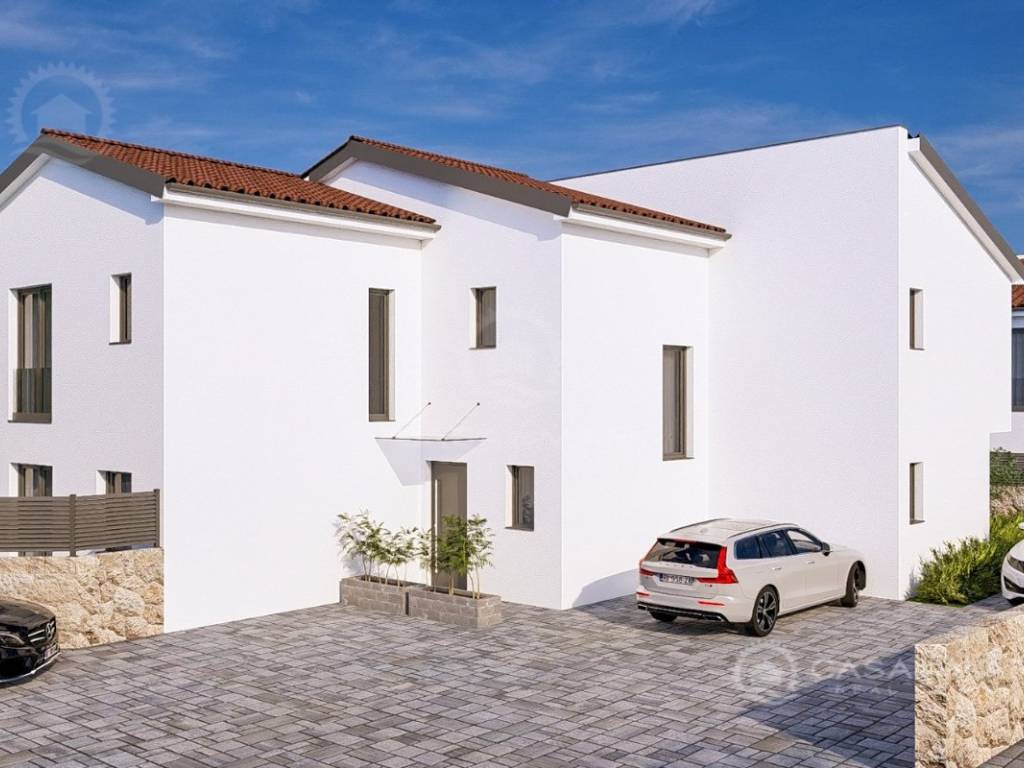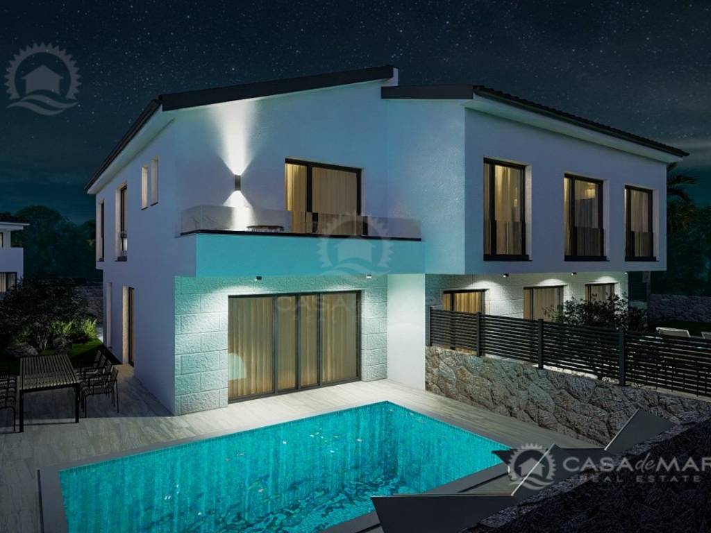 In einer ruhigen Gegend von Malinska, nur 800 Meter vom Meer entfernt, steht ein modernes Doppelhaus im Bau zum Verkauf, das einen freien Blick und hochwertige Ausstattung bietet. Diese Immobilie erstreckt sich über zwei Etagen – Erdgeschoss und Obergeschoss – mit einer gesamten Wohnfläche von 99 m² sowie einem dazugehörigen Grundstück von 150 m².