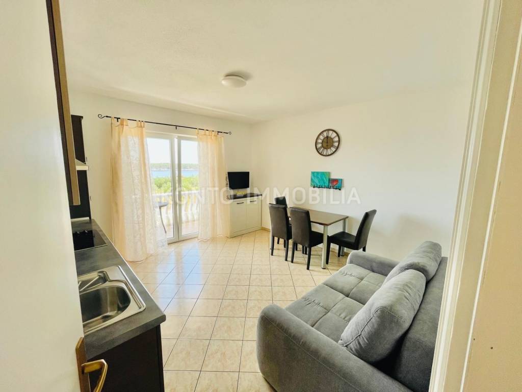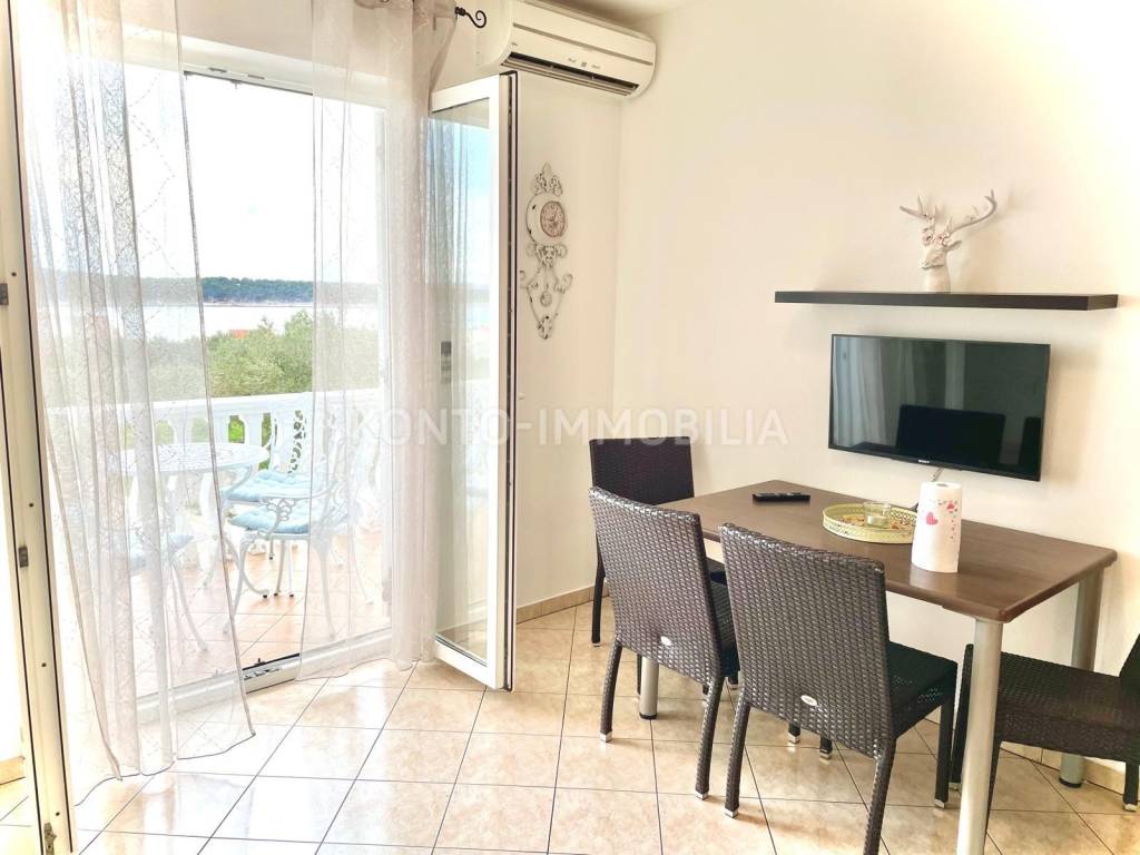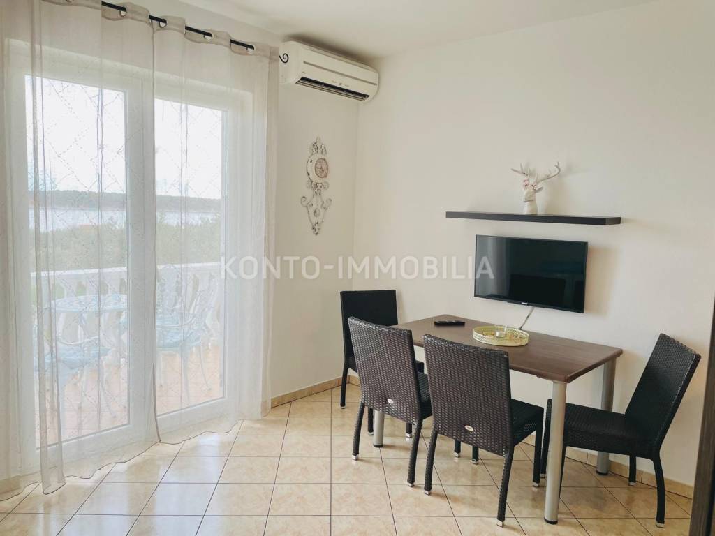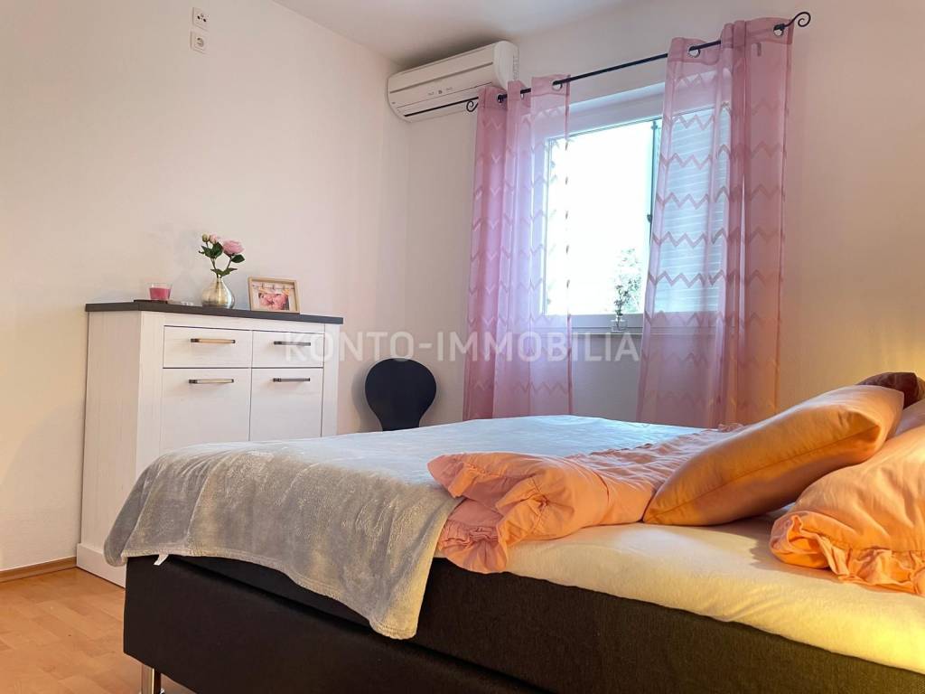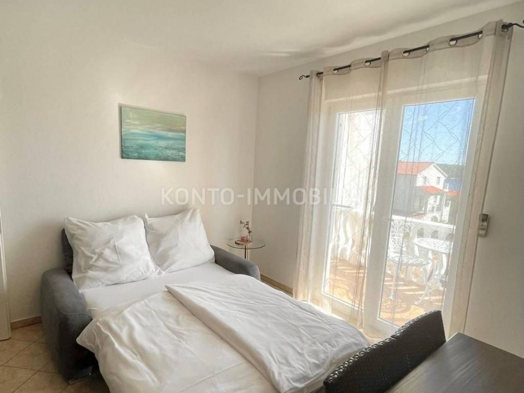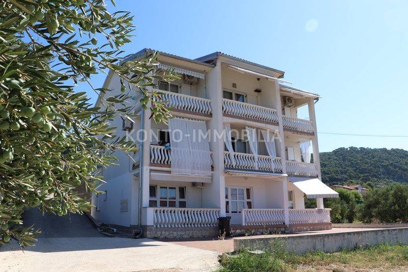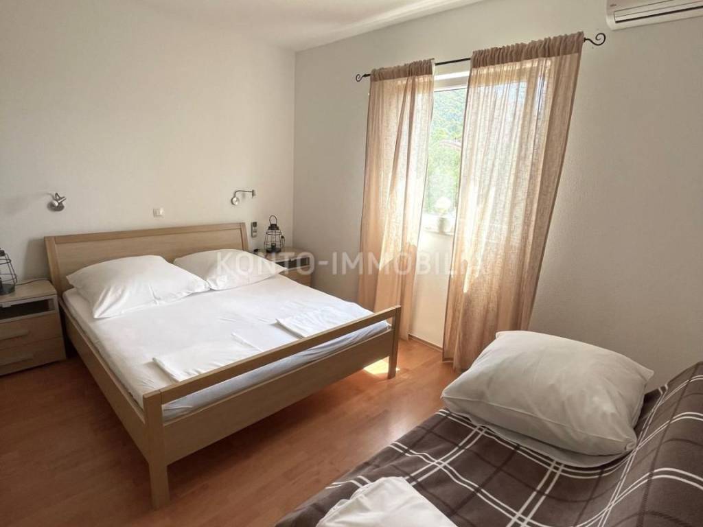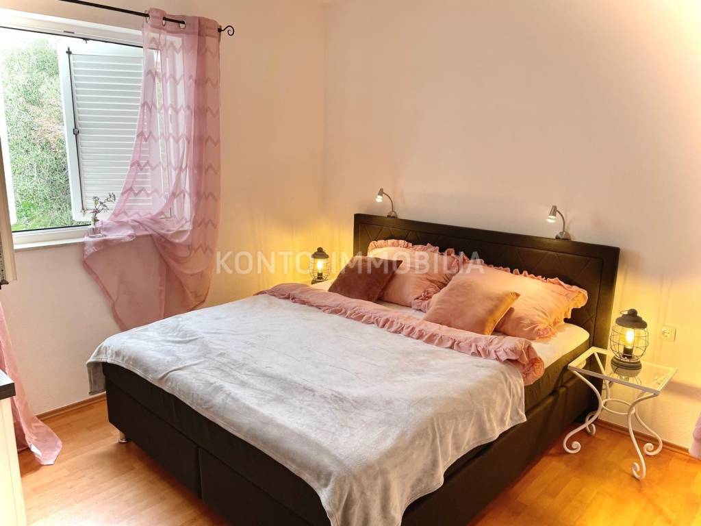 Eine Etage des Hauses zum Verkauf in Barbat, nur 200 m vom Meer entfernt, mit herrlichem Blick auf das Meer. Aufgeteilt in zwei separate Wohneinheiten, eine Einzimmerwohnung 1 Schlafzimmer + Wohnzimmer und eine Zweizimmerwohnung 2 Schlafzimmer + Wohnzimmer.. Möbliert, Klimaanlage in jedem Zimmer, 2 Parkplätze. Neues Dach im Jahr 2023.