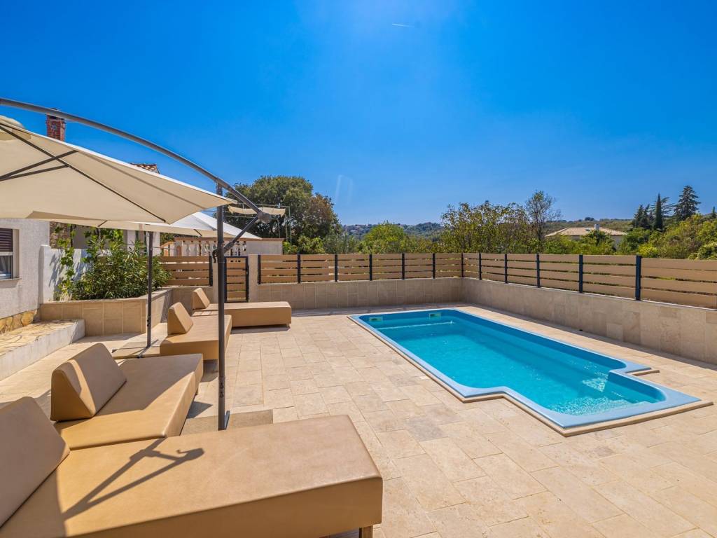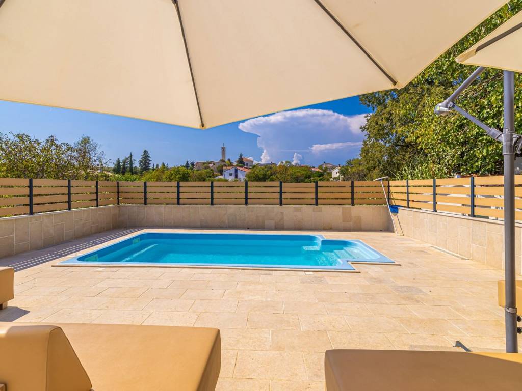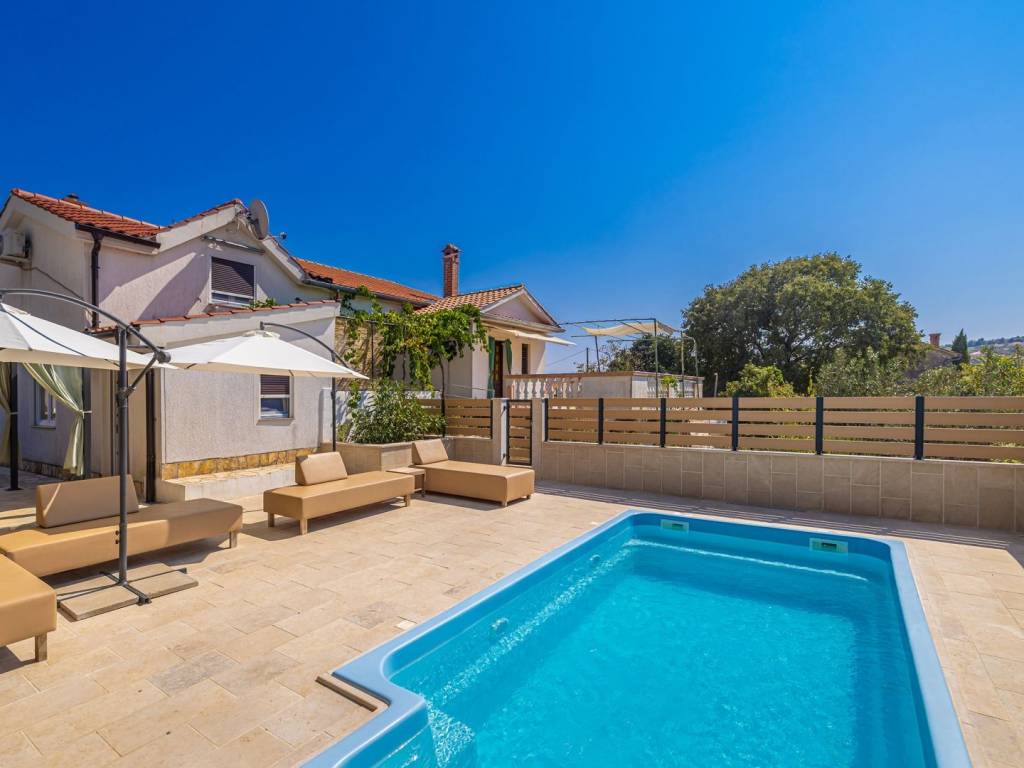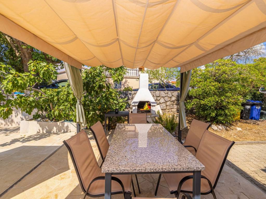 In ruhiger Lage nahe der Stadt Krk steht eine attraktive Doppelhaushälfte mit Swimmingpool und wunderschön angelegtem Garten zum Verkauf – ideal zum Entspannen und Genießen der Privatsphäre. Das Haus erstreckt sich über drei Etagen, die durch eine Innentreppe miteinander verbunden sind. Im Untergeschoss befinden sich ein Schlafzimmer, ein Badezimmer und eine praktische Waschküche. Das Erdgeschoss besteht aus einem offenen Wohnbereich mit Küche und Esszimmer, von dem aus man Zugang zum Garten mit Swimmingpool und Liegewiese hat. Im ersten Stock, dem Dachgeschoss, befindet sich ein weiteres Schlafzimmer. Der Garten bietet umfassenden Komfort mit zwei Parkplätzen, einer wunderschön angelegten Umgebung und einem Platz zum Entspannen am Pool. Die Immobilie wird komplett möbliert verkauft und ist bezugsfertig oder mietfertig. Dieses Haus in ruhiger Lage in der Nähe von Krk ist perfekt für alle, die eine Kombination aus Entspannung, Privatsphäre und modernem Lebensstil suchen. Kontaktieren Sie uns und vereinbaren Sie einen Besichtigungstermin!