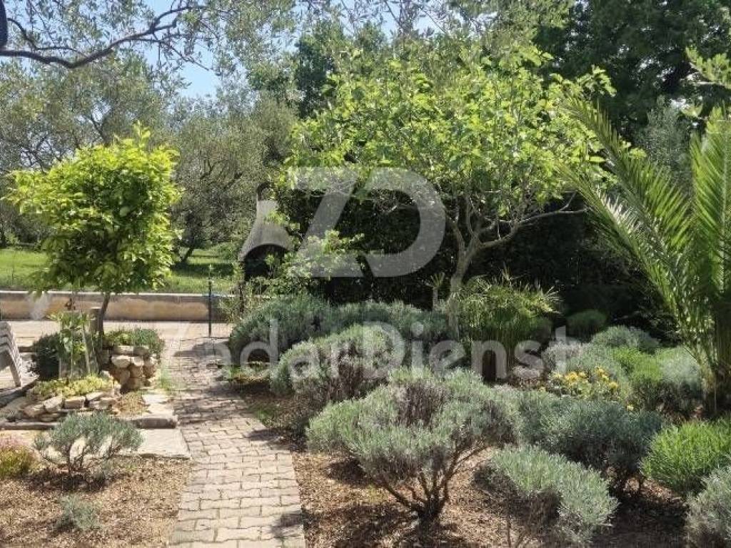 Vor der Wohnung befindet sich ein wunderschöner Garten mit mediterranen Pflanzen und einem Außengrill zum Genießen der Sommerabende. Auf der Rückseite gibt es außerdem eine kleine möblierte Terrasse zum Sitzen und Entspannen.