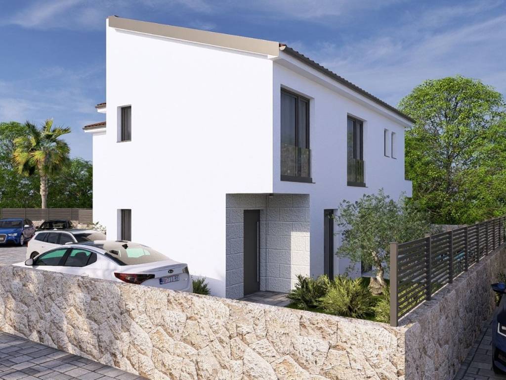 Dieses moderne Doppelhaus in einem ruhigen Teil von Malinska vereint perfekt Komfort und modernes Design. Im Erdgeschoss befindet sich ein geräumiges Wohnzimmer, das mit dem Esszimmer und der Küche verbunden ist und einen funktionalen und offenen Raum für Familientreffen schafft. Auf dieser Etage gibt es außerdem ein praktisches Gäste-WC und eine überdachte Terrasse, die zu einem privaten Pool und einem angelegten Garten führt, ideal zum Entspannen und Genießen der Privatsphäre. Im Obergeschoss befinden sich drei Schlafzimmer, von denen eines über ein eigenes Badezimmer verfügt, während sich die anderen beiden ein gemeinsames Badezimmer teilen. Die Aufteilung ist so gestaltet, dass sie allen Familienmitgliedern oder Gästen Bequemlichkeit und Komfort bietet. Das Haus verfügt über keinen Balkon, aber das Design ermöglicht eine maximale Nutzung des Innenraums für einen komfortablen Aufenthalt. Das Haus ist mit hochwertigen Materialien ausgestattet, darunter moderne Keramik und Sanitärartikel, Fußbodenheizung mit intelligenter WLAN-Steuerung und Klimaanlage in jedem Raum. Mit zwei privaten Parkplätzen ist das Anwesen nur 600 Meter vom Zentrum von Malinska und dem Meer entfernt und bietet eine ideale Balance zwischen Ruhe und Nähe zu allen Annehmlichkeiten. Die geplante Fertigstellung der Bauarbeiten ist Dezember 2025. Wenn Sie auf der Suche nach einem modernen Zuhause in toller Lage sind oder in eine Immobilie mit hohem Potenzial investieren möchten, sollten Sie sich diese Gelegenheit nicht entgehen lassen. Kontaktieren Sie uns für weitere Informationen und sichern Sie sich rechtzeitig Ihr neues Haus!
