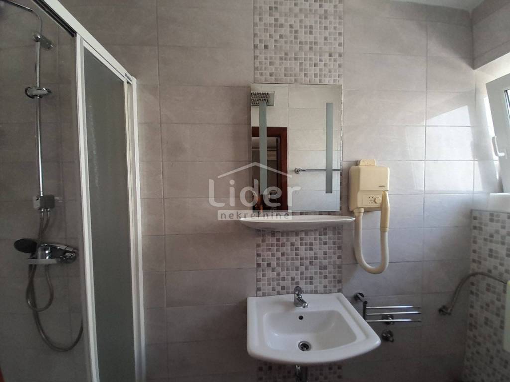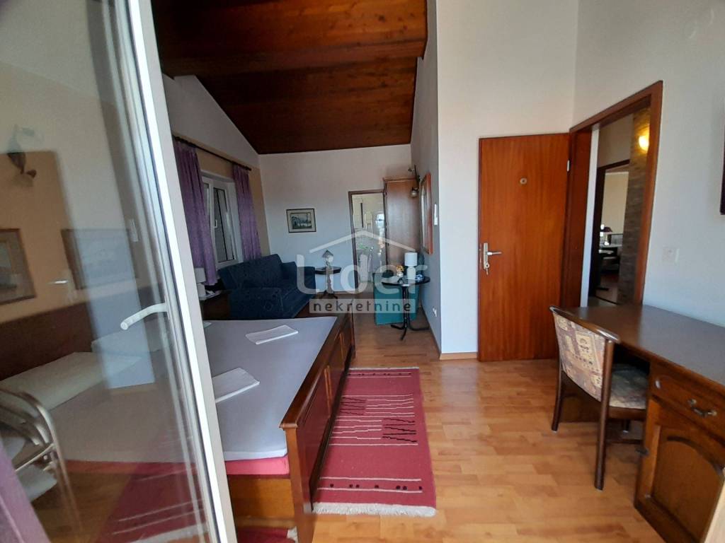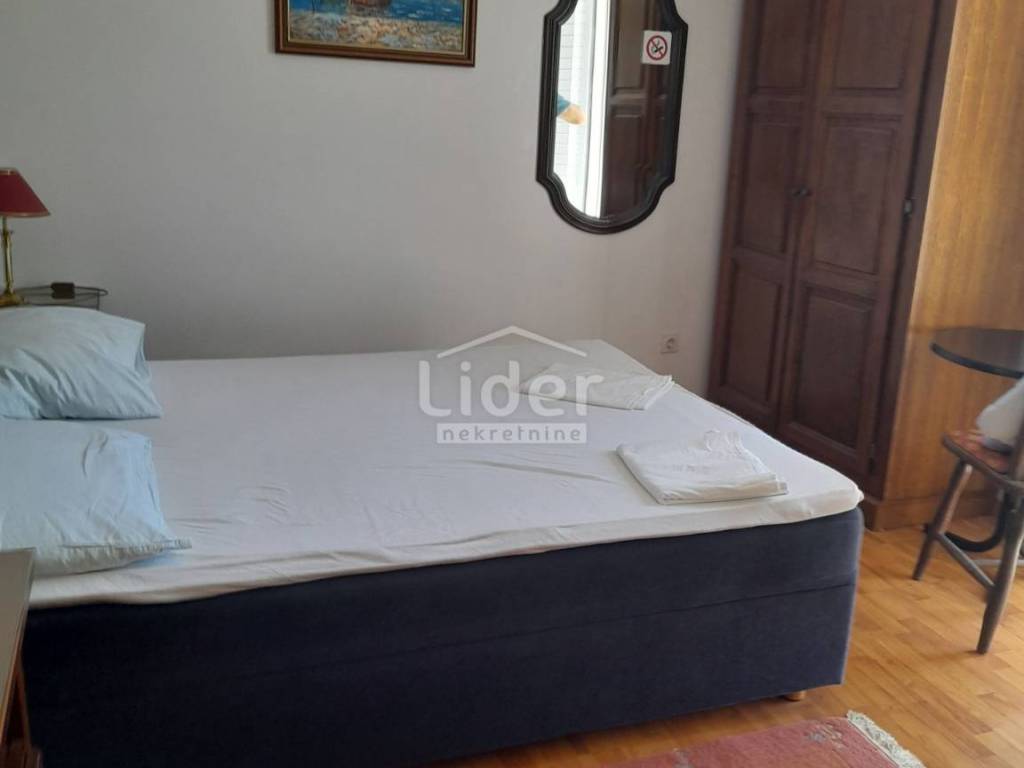Eine wunderschöne freistehende Villa auf vier Etagen mit einem wunderschön angelegten Garten. Im Erdgeschoss befinden sich zwei Wohnungen mit Terrasse, separater Küche und Esszimmer. Im Außenbereich gibt es eine Sommerküche, eine Garage für zwei Autos und mehrere Parkplätze. Im ersten Stock befindet sich eine Wohnung bestehend aus einem großen Wohnzimmer mit Küche und Esszimmer sowie zwei Schlafzimmern mit Balkon, einem Badezimmer, einem Flur und einer Toilette. Im zweiten Stock befinden sich fünf Schlafzimmer mit Badezimmern und Balkonen sowie Meerblick. Im dritten Stock befinden sich drei Schlafzimmer mit Badezimmern und Balkonen. Die ersten beiden Etagen verfügen über eine Ölzentralheizung, während die zweiten beiden Etagen über Klimaanlagen verfügen. Sonnenkollektoren auf dem Dach für Warmwasser. Die Entfernung zum Meer beträgt 300 m. Es wird komplett möbliert verkauft und ist bereit, das bereits etablierte Geschäft weiterzuführen.