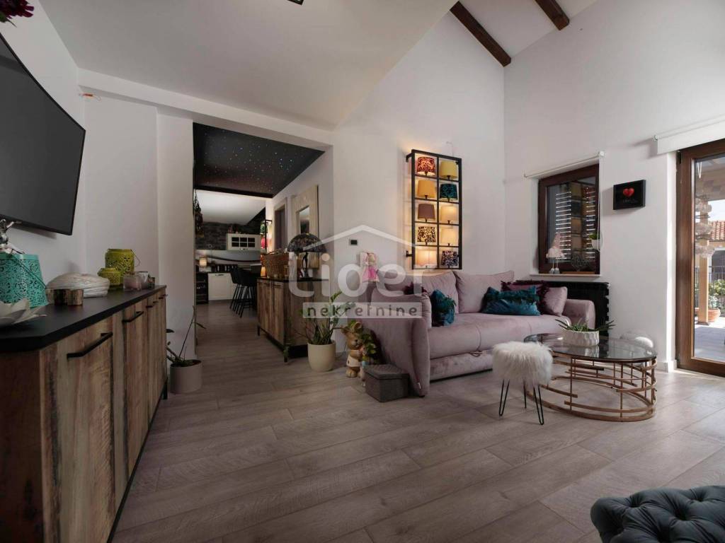 Bei der Dekoration des Hauses wurde eine perfekte Harmonie und ein Kompromiss zwischen der ursprünglichen Form traditioneller Steinhäuser und dem modernen Einrichtungsstil erreicht, was zu einem attraktiven, aber auch funktionalen Innenraum führte, der niemanden gleichgültig lässt.