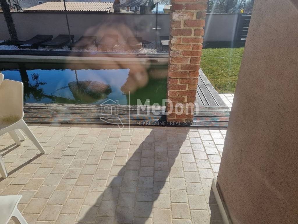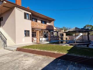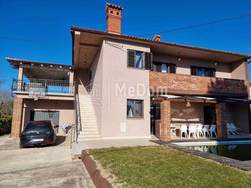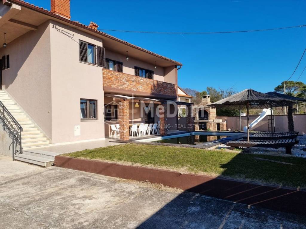 Auf der Ostseite Istriens, 4 km vom Meer entfernt, steht ein Haus mit Swimmingpool und einer Wohnfläche von 250 m2 zum Verkauf. Das Erdgeschoss des Hauses besteht aus einer Küche, einem Esszimmer, einem Wohnzimmer, 3 Schlafzimmern, 2 Badezimmern und einer Toilette. Vom Wohnzimmer aus gibt es eine überdachte Terrasse und einen Swimmingpool. Neben dem Pool gibt es auch einen schönen Außengrill. Die erste Etage des Hauses ist über Innen- und Außentreppen erreichbar und besteht aus 3 Schlafzimmern, 2 Badezimmern, einem mit verschiedenen Geräten ausgestatteten Raum für Gesellschaftsspiele, einem Raum mit Sauna und Massagewanne. Die erste Etage verfügt über zwei eigene Terrassen mit Blick in die Natur. Auf der größeren überdachten Terrasse gibt es einen Whirlpool. Das Haus verfügt außerdem über eine eigene Garage von 35 m2, einen Heizraum mit Ofen für Pellet-Zentralheizung und einen Weinkeller. Das Anwesen ist von einer Mauer umgeben, verfügt über einen angelegten Garten, einen eigenen Parkplatz für mehrere Autos und bietet viel Privatsphäre und Ruhe. Er kann das Meer und die Inseln in der Ferne sehen. Der Eigentümer des Hauses ist bereit, dem Käufer den Liegeplatz für das Boot im nahegelegenen Hafen kostenlos zu überlassen. Zur Autobahn 20 km, zum Flughafen 20 km.