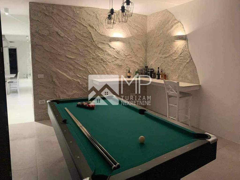 Im Erdgeschoss des Hauses befindet sich ein gelungen gestalteter offener Raum, der eine Verbindung zwischen Wohnzimmer und Küche mit Ausgang zur überdachten Terrasse, einer Toilette und einem als Taverne gedachten Raum bietet, in dem sich ein Kamin befindet und ein Billardtisch, der zwei Funktionen hat (zum Spielen und geselligen Beisammensein oder zum Servieren von Speisen, wenn er geschlossen und mit einer Tischdecke bedeckt ist).