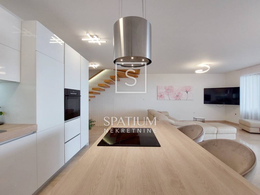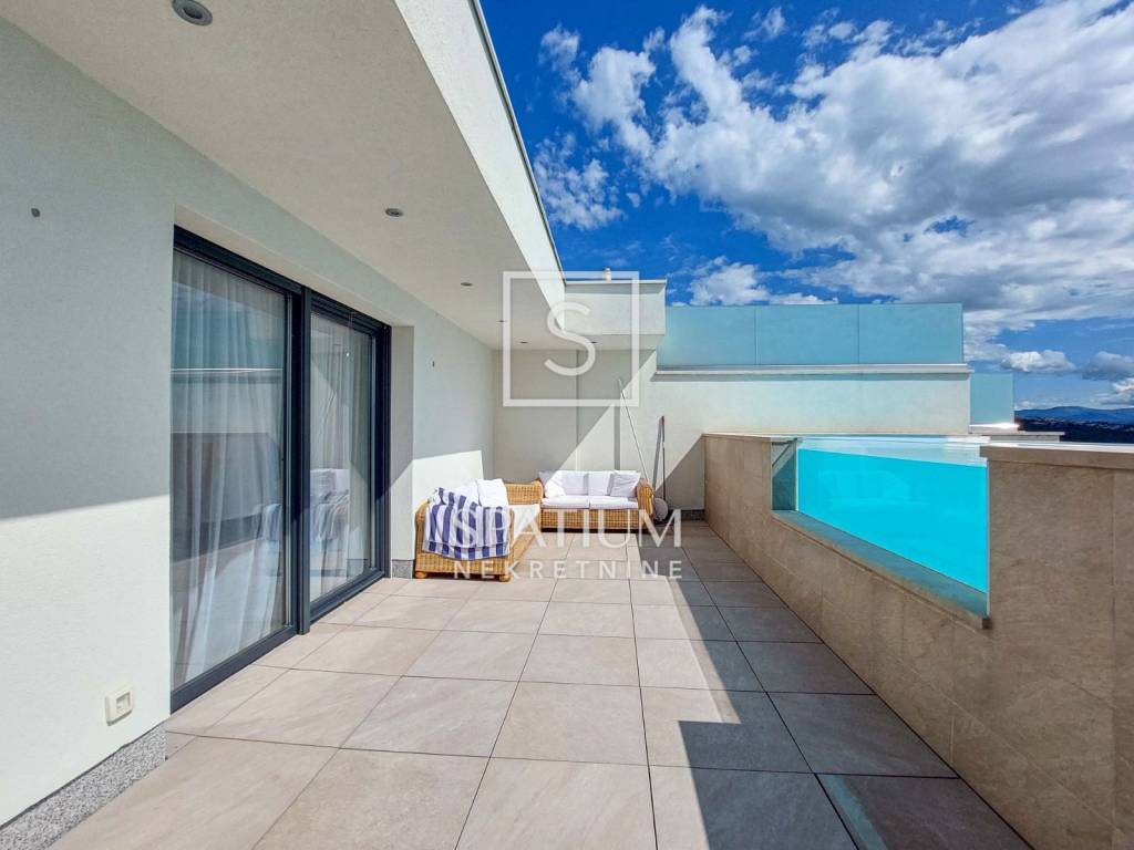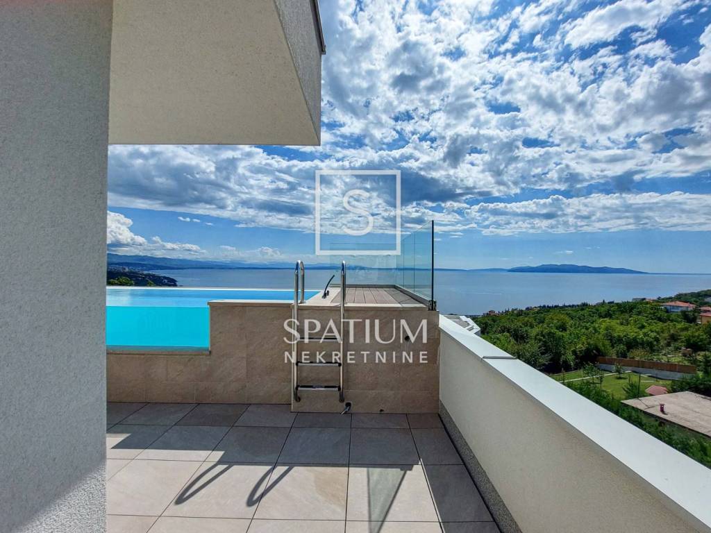 OPATIJA, POBRI, wir bieten ein fantastisches Doppelhaus in ruhiger und ruhiger Lage mit Panoramablick auf das Meer. Die Gesamtfläche des Hauses beträgt 250 m2 und es liegt auf einem Grundstück von 370 m2. Es besteht aus: Keller – Garage, Platz für Taverne und Maschinenraum. Erdgeschoss – 2 Schlafzimmer mit Badezimmern, Fitnessraum, Waschküche und Terrasse. 1. Stock – großes offenes Wohnzimmer mit Küche und Esszimmer, Schlafzimmer, Badezimmer, Abstellraum und großem Terrasse mit Blick auf das Meer, 2. Etage – großes Schlafzimmer mit Bad, Zugang zu einer großen Dachterrasse, Infinity-Pool. Das ganze Haus verfügt über Fußbodenheizung und in jedem Raum eine Klimaanlage, Aluminiumschreinerei mit Schiebewänden und elektrischen Rollläden, Sicherheitstüren , Klimaanlagen und auf den Böden gibt es Fliesen in Marmorimitation, während die Treppe zum Erdgeschoss aus Marmor im gleichen Farbton besteht. Das gesamte Haus ist mit Steinpflaster ausgelegt und vor dem Haus gibt es Platz für 2 Autos, eine Garage für 1 Auto, während weitere Autos im Garten geparkt werden können.