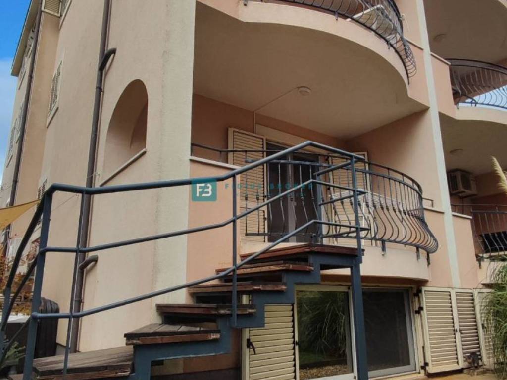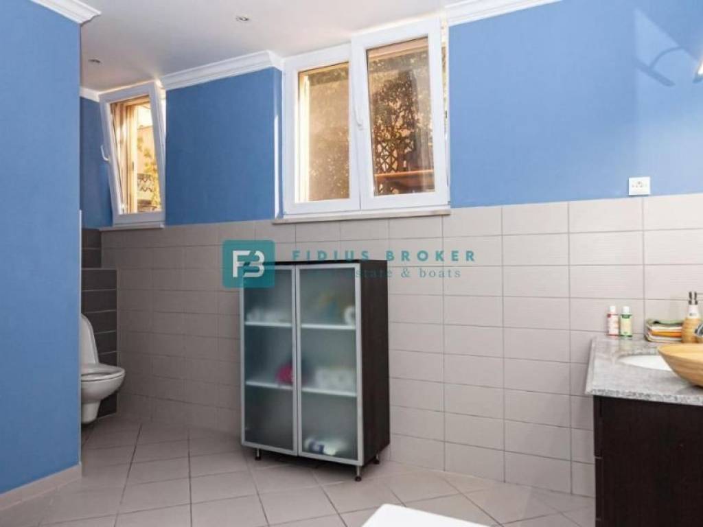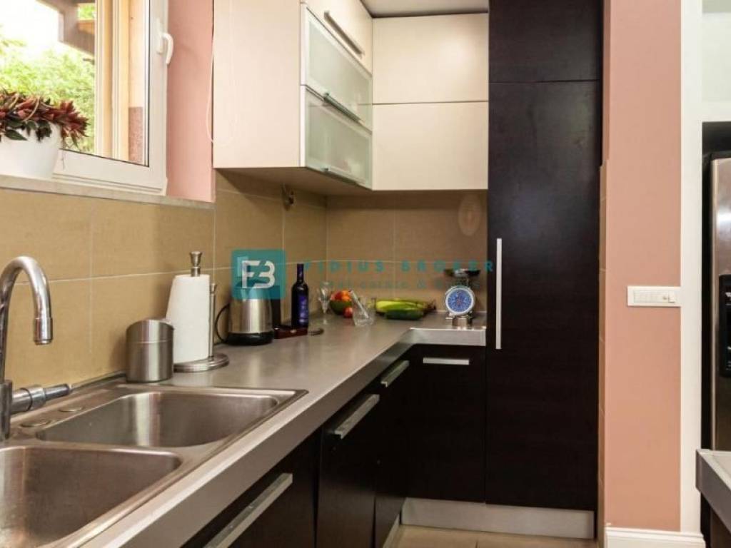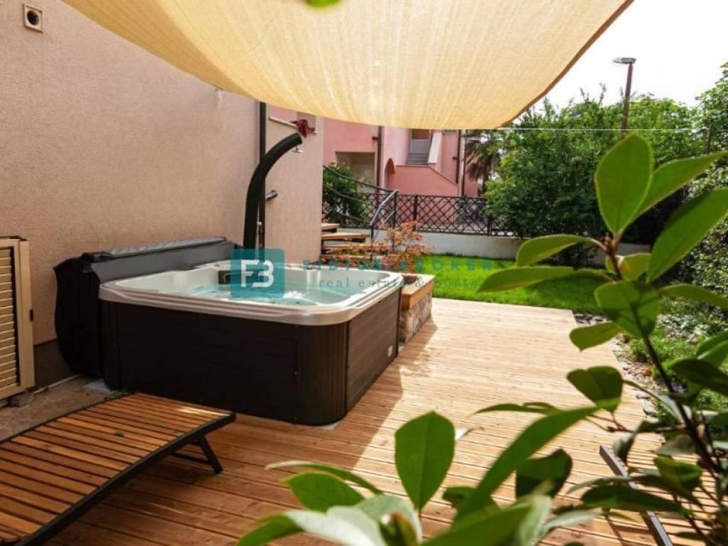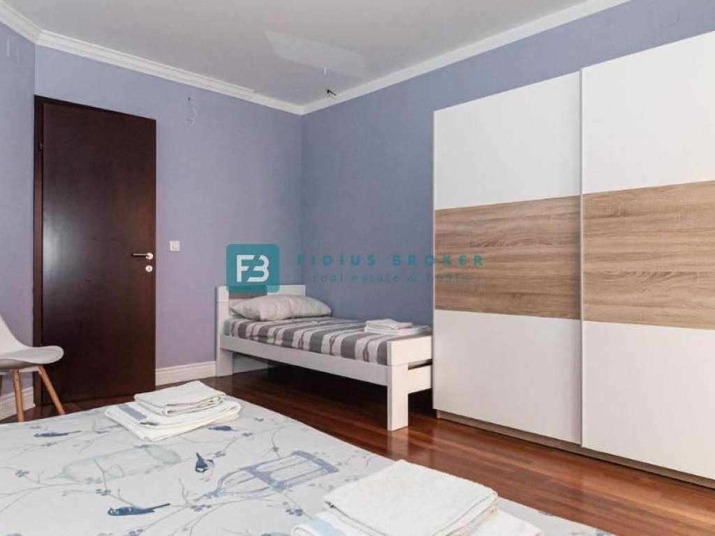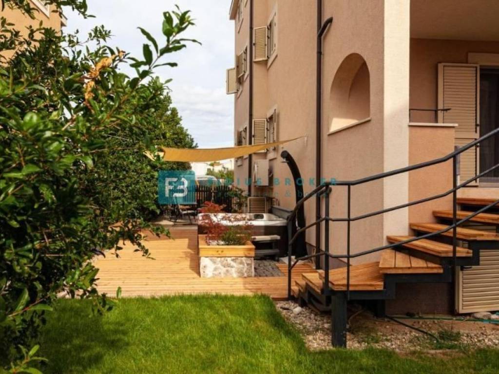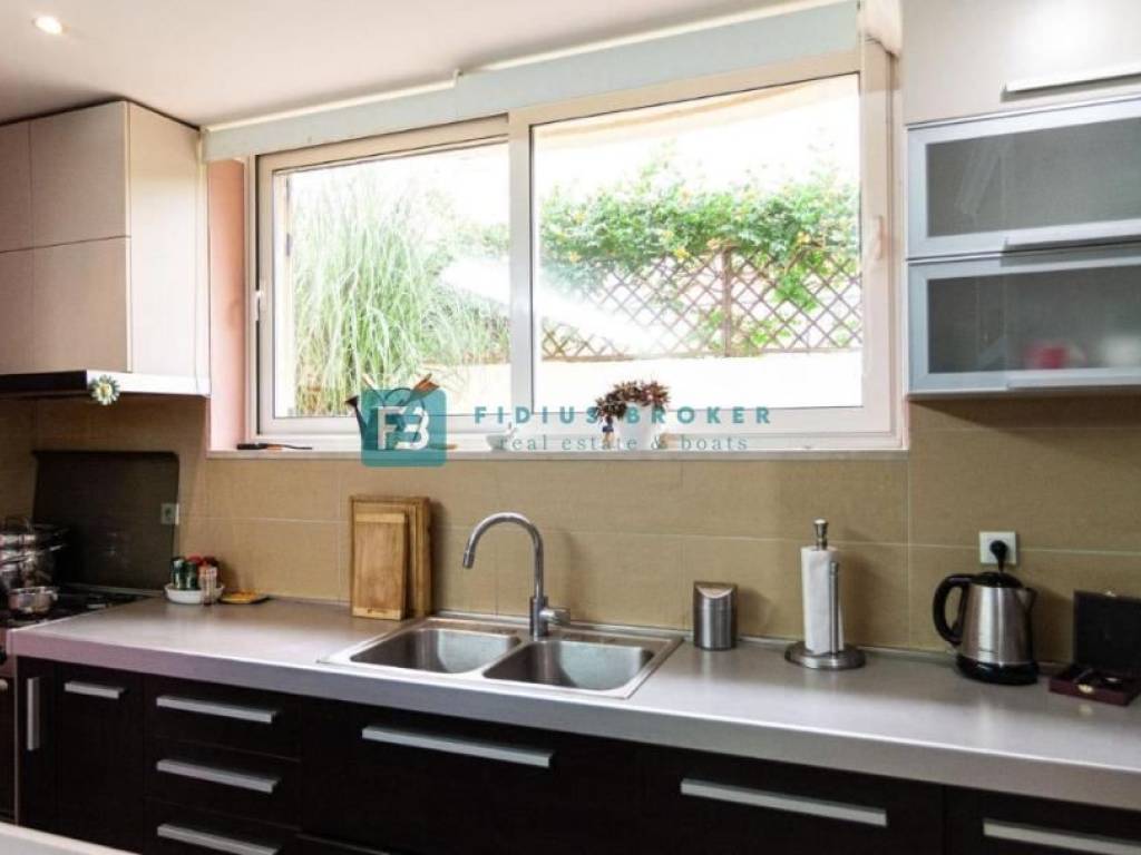 Die zweistöckige Wohnung verteilt sich auf das Unter- und Obergeschoss (Keller + Obergeschoss) des Wohnhauses und verfügt über eine Nettonutzfläche von 171,07 m2 + eine Garage von 29 m2 + einen Hof von 150 m2. Die untere Etage mit einer Gesamtfläche von 125 m2 besteht aus einer Treppe, einem Haupteingang, einem Schlafzimmer, einem Badezimmer, einem geräumigen Wohnzimmer und einer ausgestatteten Küche mit Esszimmer. Eine Innentreppe führt in das Obergeschoss mit einer Gesamtfläche von 46 m2, das aus einem Badezimmer, zwei Schlafzimmern, von denen eines Zugang zu einer überdachten Terrasse von 9,65 m2 hat, besteht. Von der Terrasse aus haben Sie Zugang zu einem wunderschön angelegten Garten mit Whirlpool, Grill, Liegestühlen, einem Platz zum Sonnenbaden und Sitzen im Schatten sowie einem gepflegten grünen Garten, der mit automatischer Bewässerung gepflegt wird. Außerdem gibt es eine überdachte Garage mit Fernöffnung.