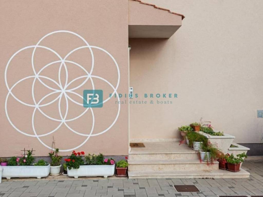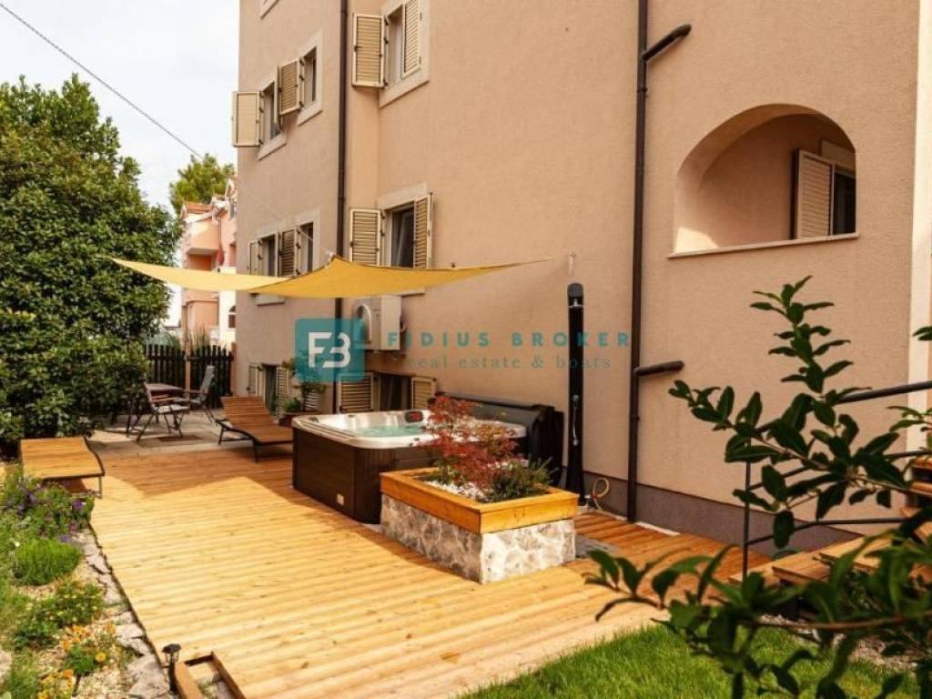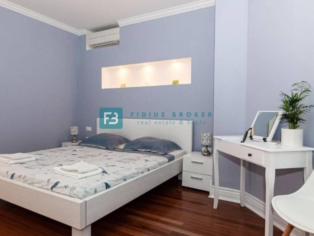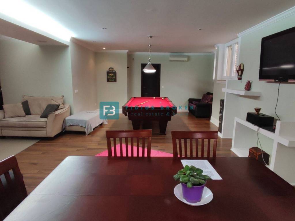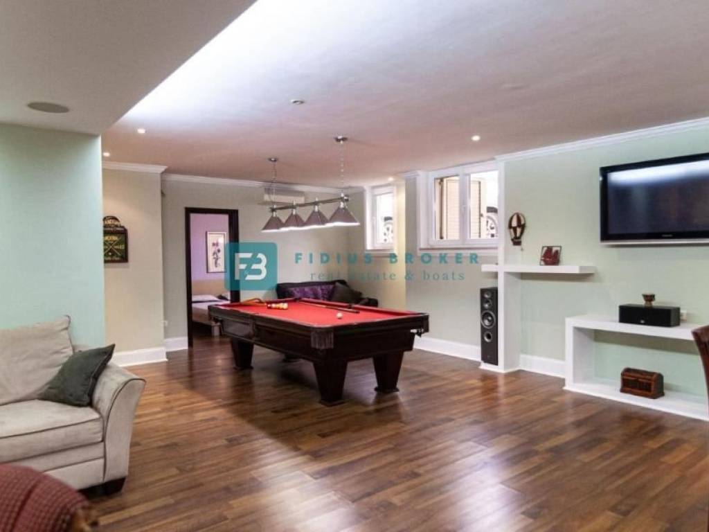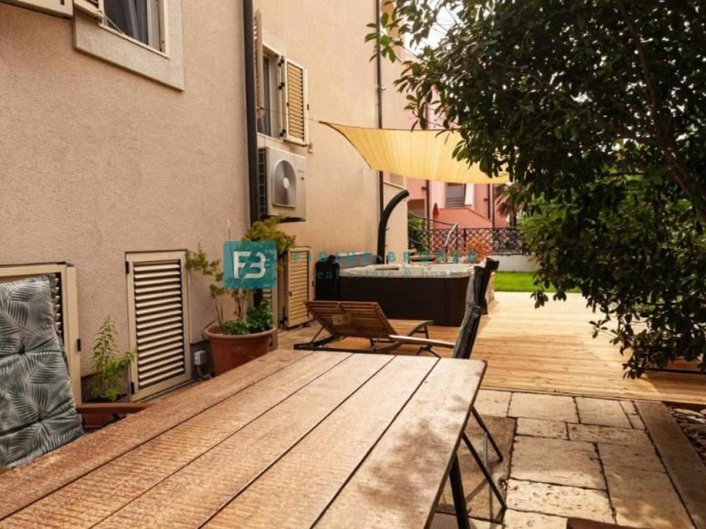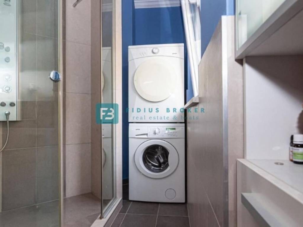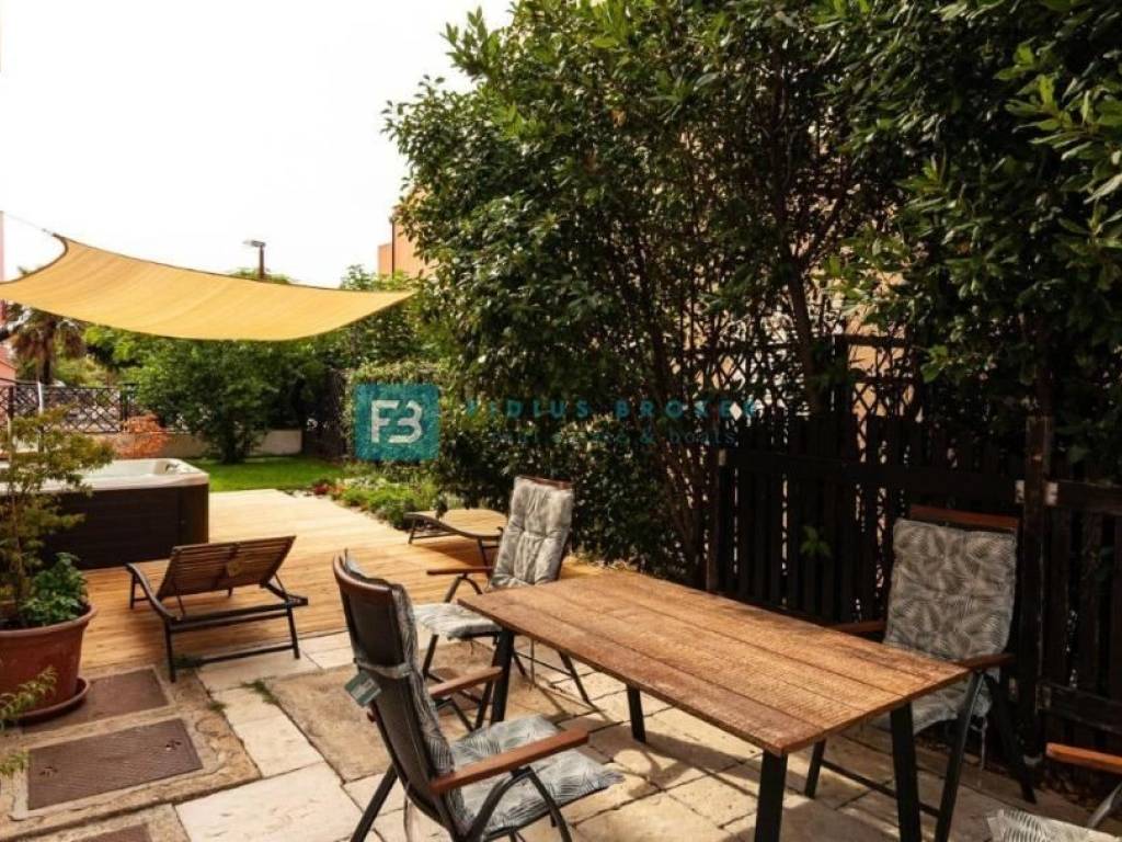 Die zweistöckige Wohnung verteilt sich auf das Unter- und Obergeschoss (Keller + Obergeschoss) des Wohnhauses und verfügt über eine Nettonutzfläche von 171,07 m2 + eine Garage von 29 m2 + einen Hof von 150 m2. Die untere Etage mit einer Gesamtfläche von 125 m2 besteht aus einer Treppe, einem Haupteingang, einem Schlafzimmer, einem Badezimmer, einem geräumigen Wohnzimmer und einer ausgestatteten Küche mit Esszimmer. Eine Innentreppe führt in das Obergeschoss mit einer Gesamtfläche von 46 m2, das aus einem Badezimmer, zwei Schlafzimmern, von denen eines Zugang zu einer überdachten Terrasse von 9,65 m2 hat, besteht. Von der Terrasse aus haben Sie Zugang zu einem wunderschön angelegten Garten mit Whirlpool, Grill, Liegestühlen, einem Platz zum Sonnenbaden und Sitzen im Schatten sowie einem gepflegten grünen Garten, der mit automatischer Bewässerung gepflegt wird. Außerdem gibt es eine überdachte Garage mit Fernöffnung.