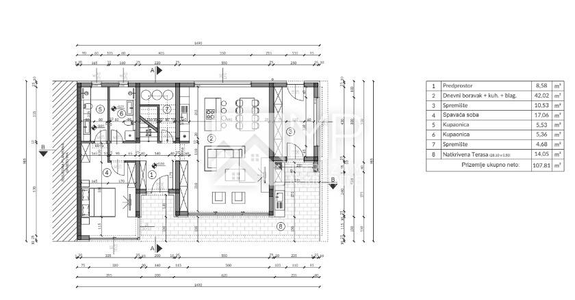 Im Erdgeschoss (107,81 m²) befinden sich ein geräumiges Wohnzimmer, das perfekt mit Küche und Esszimmer verbunden ist, sowie eine überdachte Terrasse in einem offenen Raumkonzept, ein Schlafzimmer mit eigenem Bad, ein weiteres Badezimmer und zwei Abstellräume.