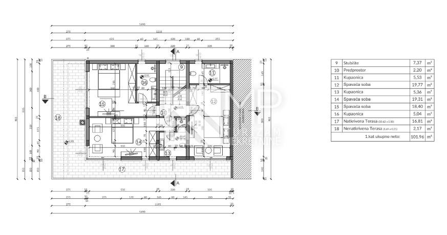 Im ersten Stock (101,96 m²) befinden sich drei Schlafzimmer, jeweils mit eigenem Bad, und eine nicht überdachte Terrasse.
