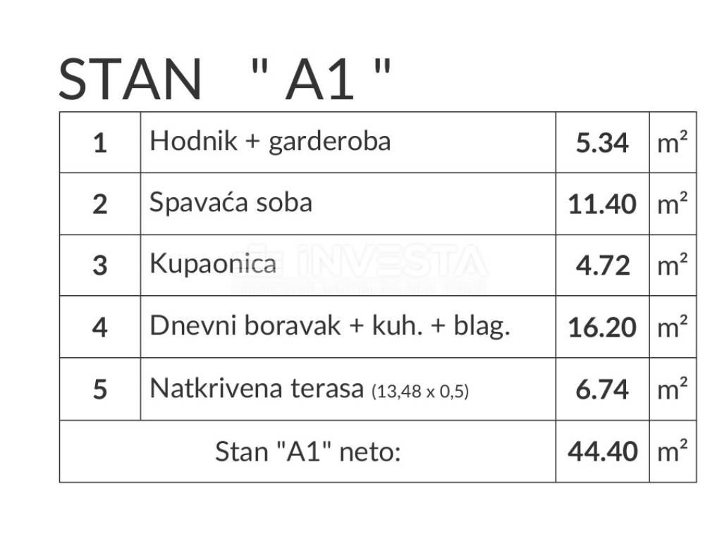 Sie hat eine Gesamtfläche von 53,46 m² und besteht aus einem Eingangsflur mit Garderobe, Badezimmer, einem Schlafzimmer, einem offenen Wohnbereich mit Küche und Esszimmer mit Zugang zur überdachten Terrasse, einem Parkplatz und einem zugehörigen Garten von 59,44 m².