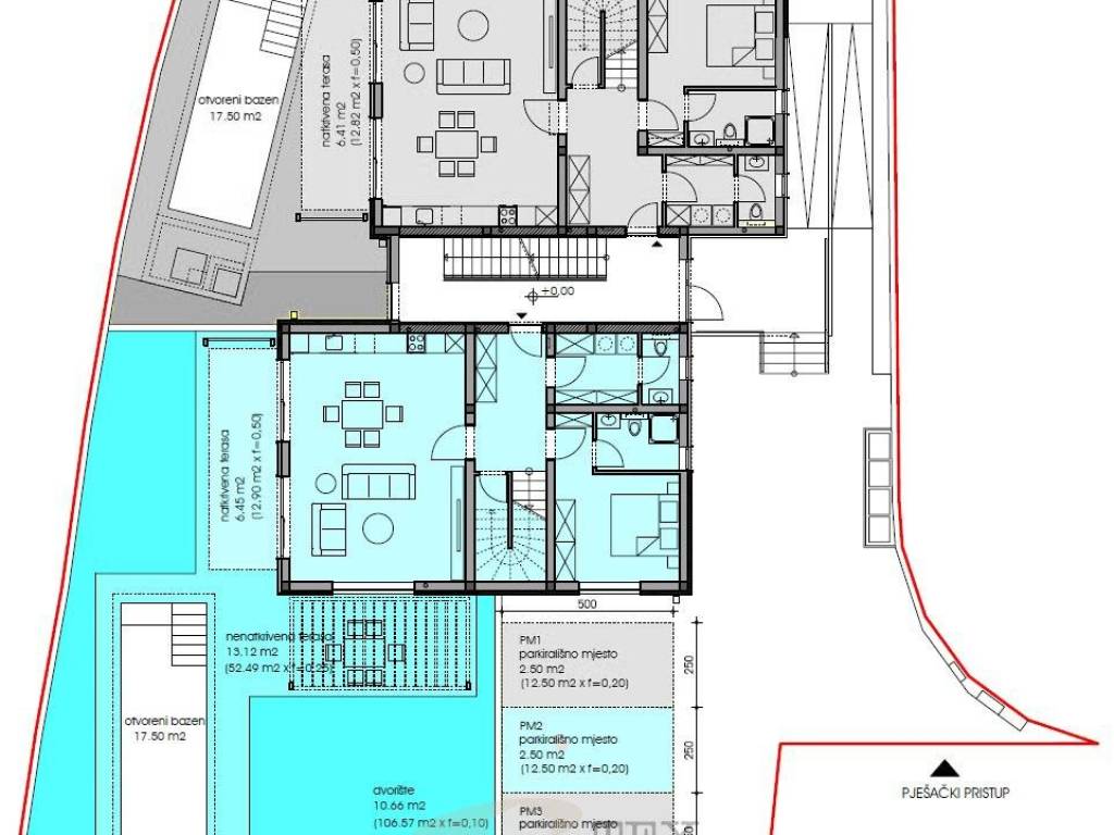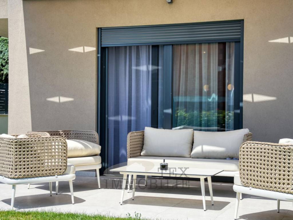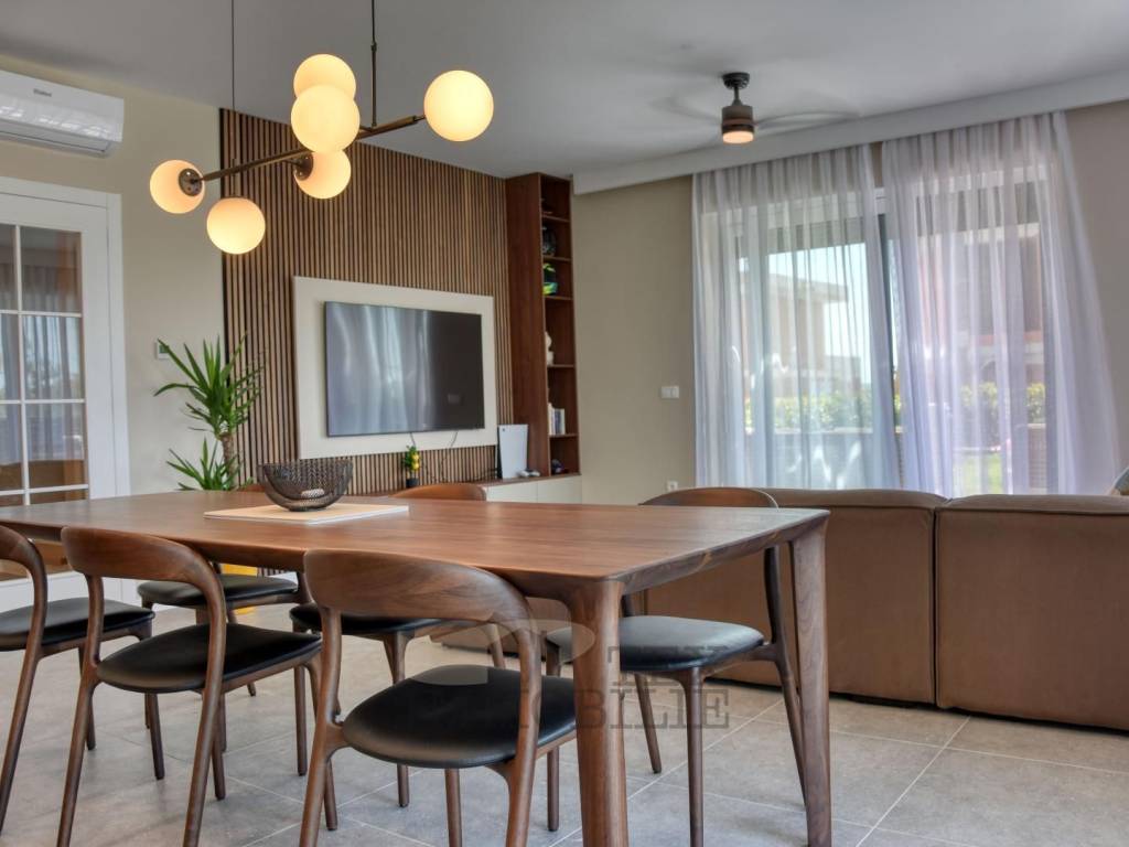 Im Erdgeschoss befinden sich ein großzügiges Wohnzimmer mit Küche und Essbereich (37,60 m²), ein Schlafzimmer mit eigenem Bad, ein Flur, ein Gäste-WC und ein Technikraum. Vom Wohnzimmer gelangt man in den Garten (110,22 m²), der einen privaten Pool von 17,50 m² und eine überdachte Terrasse von 12,82 m² umfassen wird.