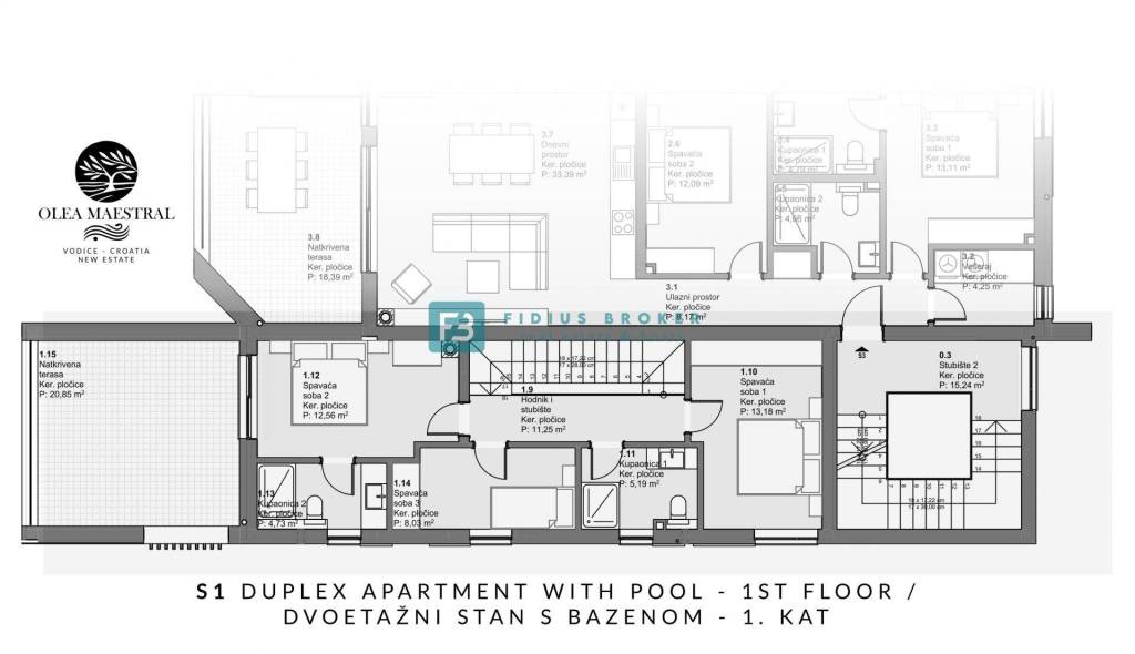Die zweistöckige Wohnung S1 verfügt über eine Nettonutzfläche von 165,37 m² (109,27 m² Wohnfläche + Terrasse + Pool 27,26 m² + Garten 145,02 m² + Parkplatz) und erstreckt sich über zwei Etagen: Erdgeschoss + 1. Obergeschoss. Sie besteht aus Eingangsbereich, separatem Badezimmer, Abstellraum, WC/Waschküche, offener Küche mit Essbereich und Wohnzimmer mit Zugang zu einer überdachten und einer nicht überdachten Terrasse, Garten, Pool und Sonnendeck. Eine Innentreppe führt ins Obergeschoss, wo sich drei Schlafzimmer befinden, eines davon mit eigenem Badezimmer und Zugang zu einer überdachten Terrasse. Die geräumige Wohnung besticht durch ihr modernes Design und die funktionale Raumaufteilung, die für mehr Privatsphäre und maximalen Wohnkomfort sorgt. Zu den Hauptvorteilen dieser Immobilie zählen der private Pool und der angelegte Garten, die zum Entspannen und Genießen der Natur einladen. Zur Wohnung gehört ein Parkplatz mit der Kennzeichnung PM1.