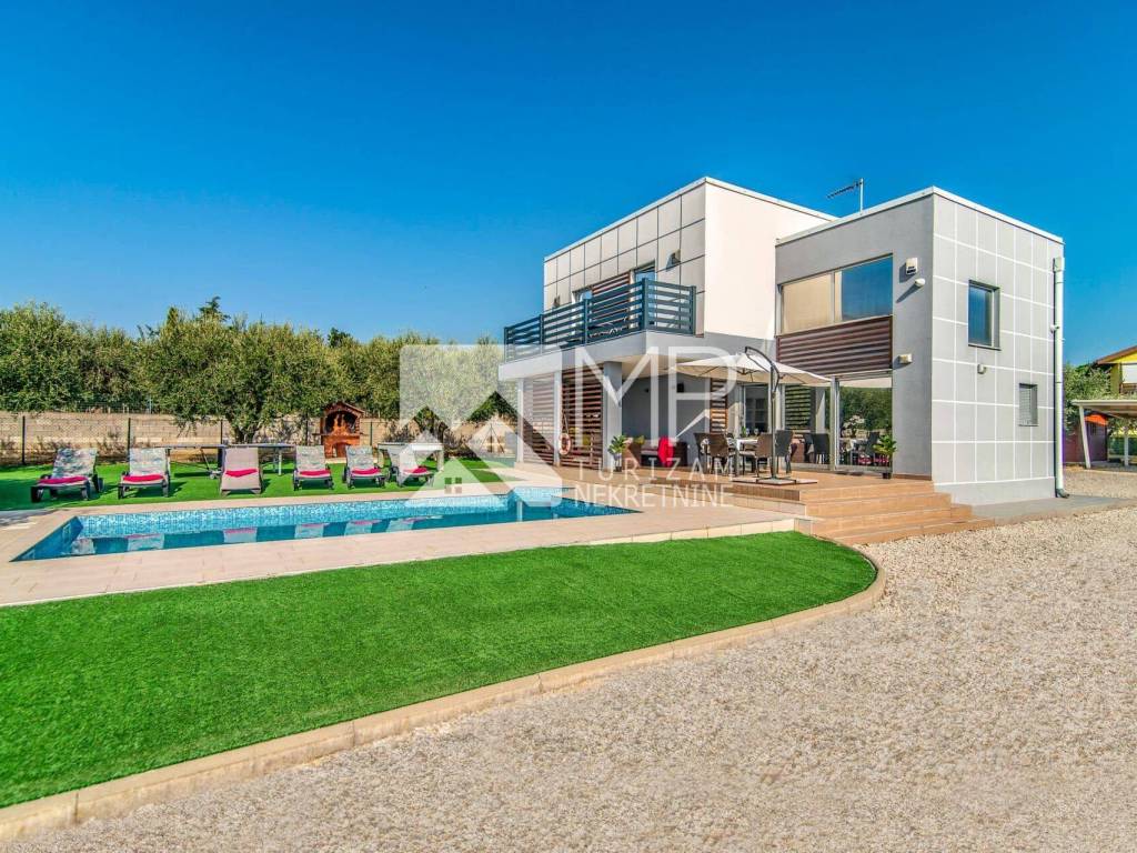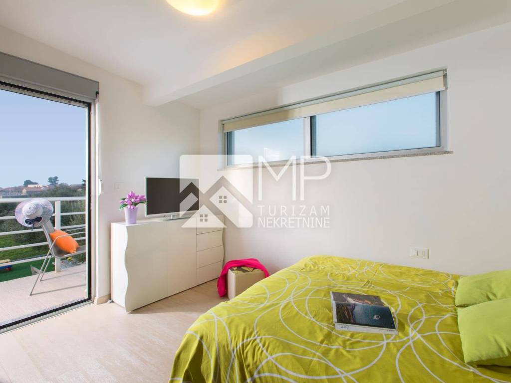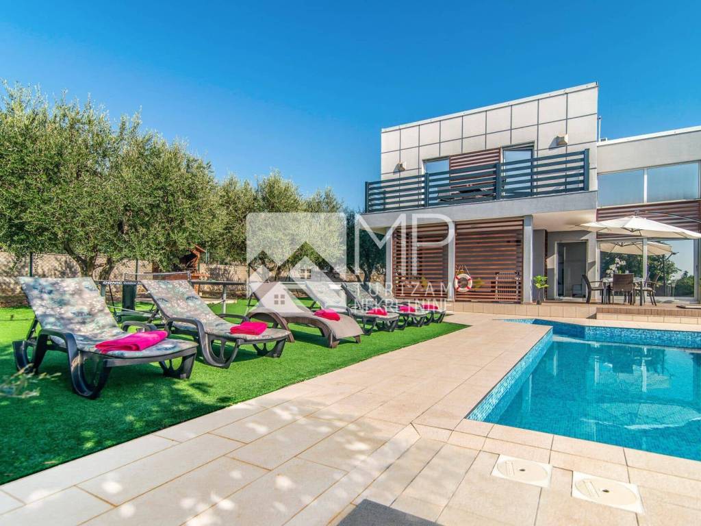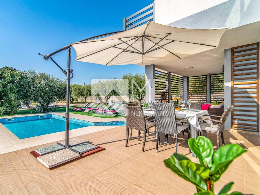 Diese beeindruckende und moderne Villa liegt in einem ruhigen Teil von Vodnjan, nur 10 Gehminuten vom Zentrum entfernt, und bietet einen wunderschönen Blick auf das Meer und die Brijuni-Inseln.