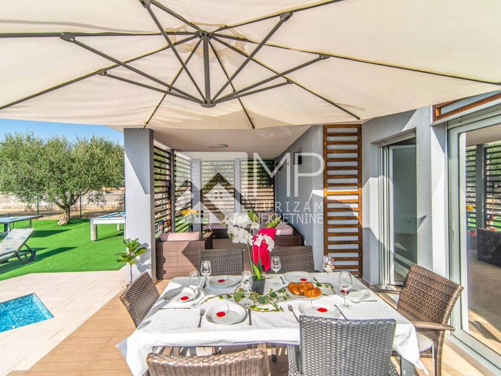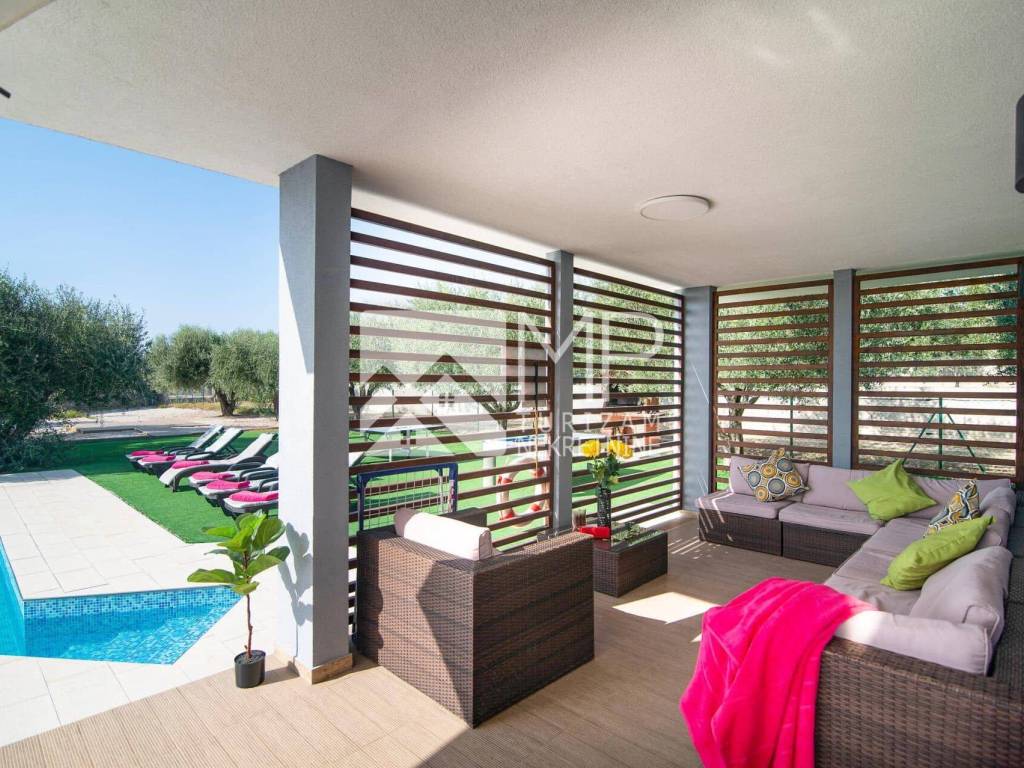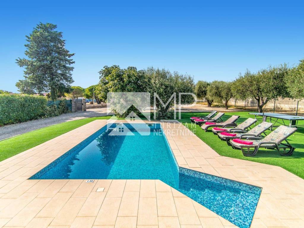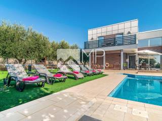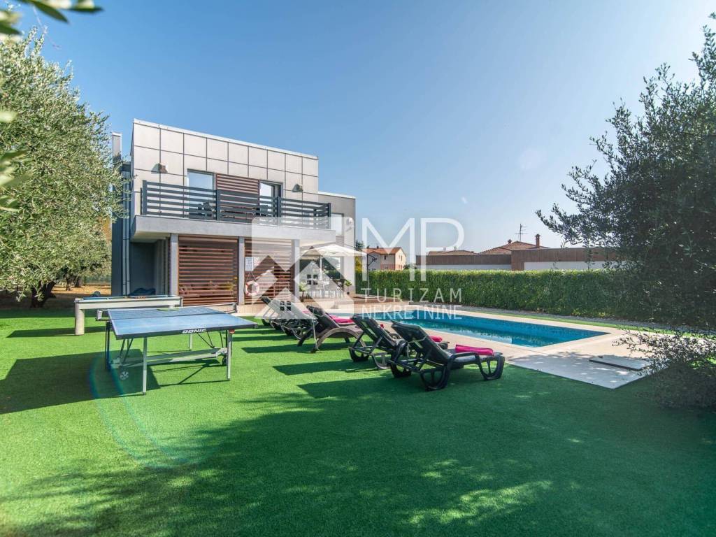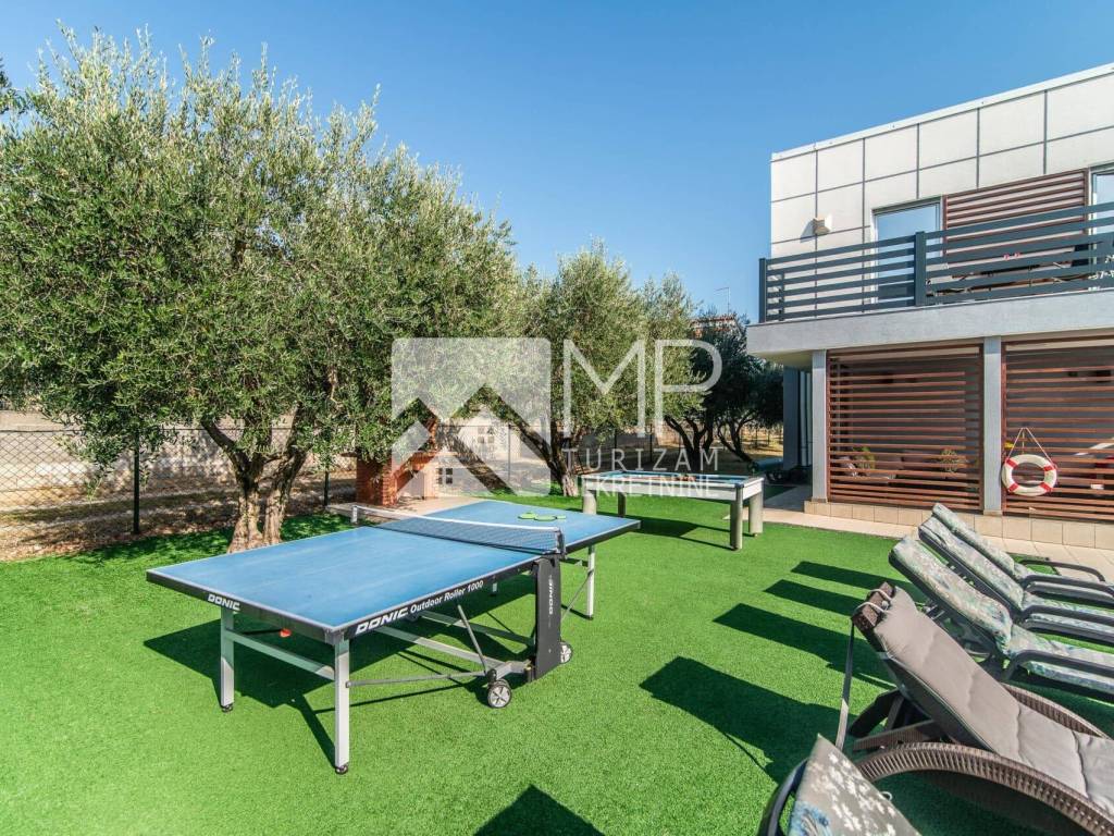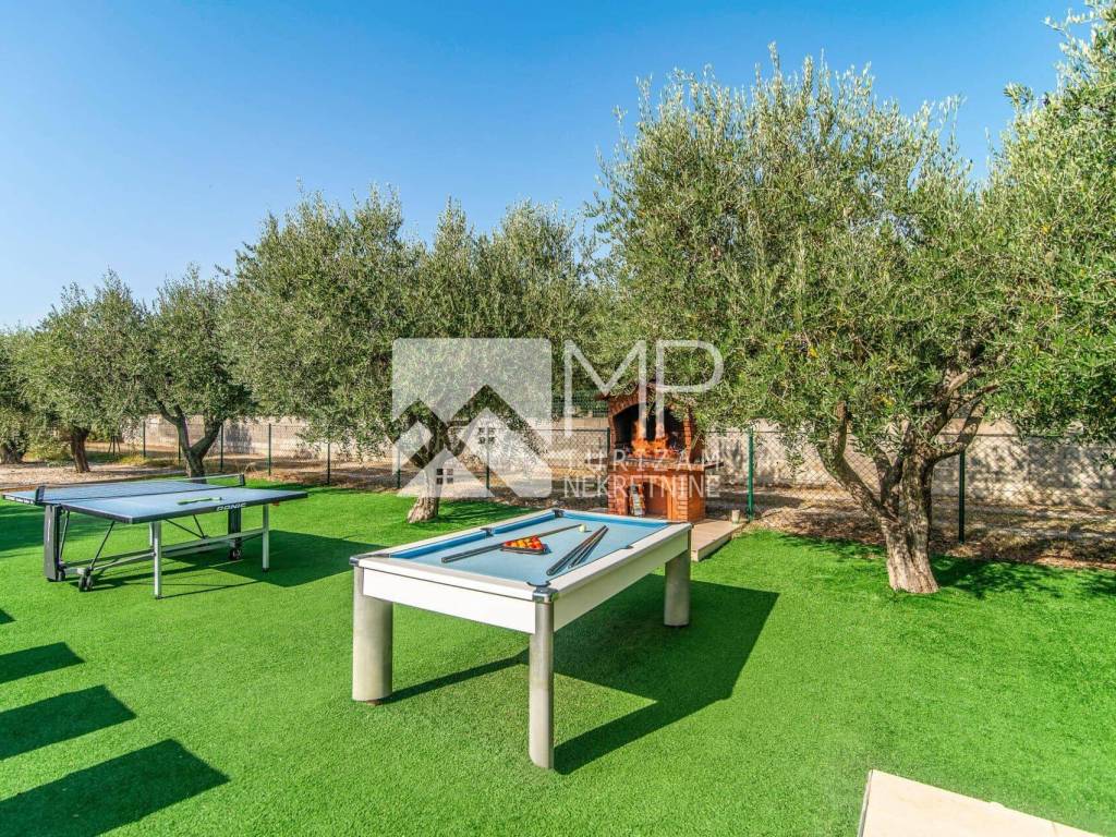 Die Villa liegt auf einem großzügigen Grundstück mit einem gepflegten Garten und Olivenbäumen – ideal zum Spielen und Entspannen. Die elegante Holzterrasse am Pool lädt zum Sonnenbaden ein, während der gemauerte Grill und der Essbereich im Freien zum Genießen der Mahlzeiten an der frischen Luft einladen. Billard und Tischtennis sorgen für Unterhaltung.