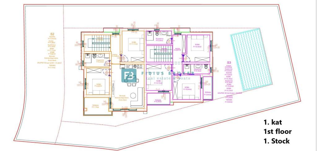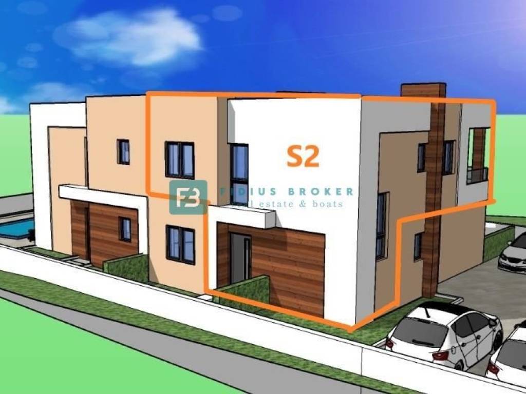 Das Apartment S3 erstreckt sich über zwei Etagen: Erdgeschoss + 1. Obergeschoss, mit einer Gesamtnutzfläche von 121,42 m². Das 61,85 m² große Erdgeschoss umfasst eine Eingangshalle, einen Flur, einen Abstellraum, ein Badezimmer, ein Schlafzimmer, eine Wohnküche und ein Wohnzimmer mit Zugang zur Terrasse, einen 21 m² großen Swimmingpool und einen großzügigen Garten von 188 m². Eine Innentreppe führt in das 59,57 m² große 1. Obergeschoss mit Flur, Badezimmer und drei Schlafzimmern. Eines der Schlafzimmer verfügt über ein eigenes Badezimmer und eine Terrasse, das andere über Zugang zur Terrasse. Das Haus bietet zwei Außenstellplätze und einen separaten Eingang. Der Preis beträgt 490.000 €.