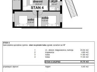 Die Wohnung befindet sich in einem Gebäude mit insgesamt vier Wohneinheiten und besteht aus einem Eingangsflur, einem offenen Wohnbereich mit Küche, Esszimmer und Wohnzimmer mit Zugang zur 6,4 m² großen Loggia, zwei Schlafzimmern und einem Badezimmer.